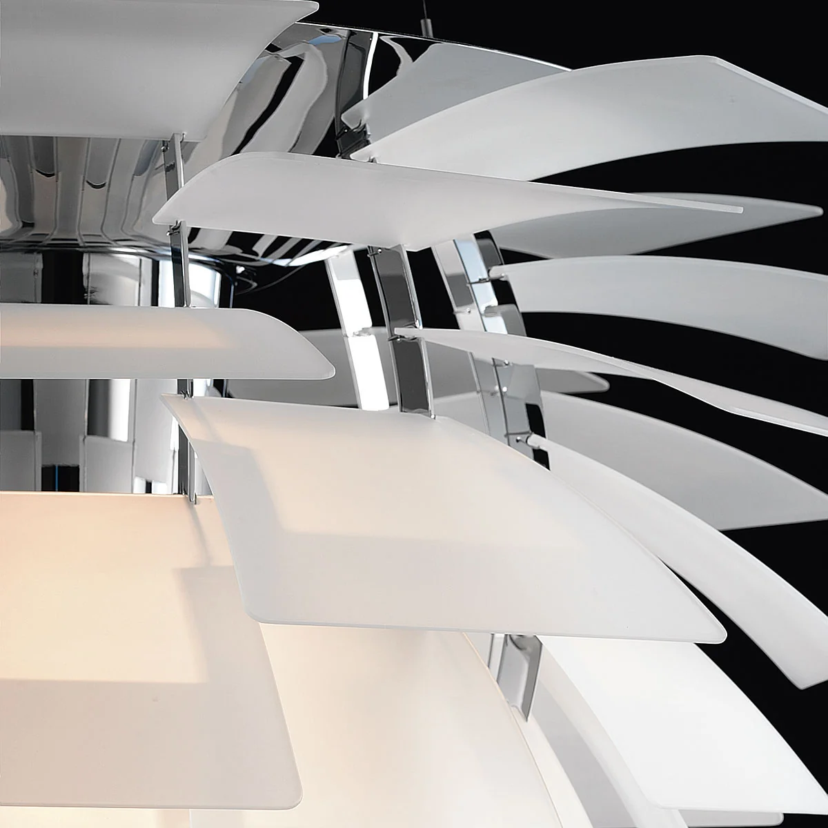 Almost as popular and undoubtedly just as stylistically confident as Henningsen's best-known work, the PH pendant lamp, is the Artichoke with its structure of twelve steel arches. On it, 72 leaves are placed in twelve circular rows, each with six leaves, which in combination are reminiscent of the shape of a cone.