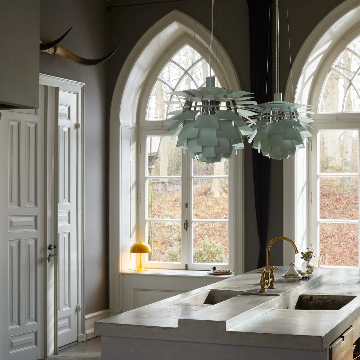 As each row is offset from the previous one, all 72 leaves can "cover" each other, creating an all-round glare-free luminaire whose light source remains concealed from every perspective. The light is transmitted and reflected onto the leaves below, creating a distinctive, unique illumination. The first Artichokes were developed for a restaurant in Copenhagen called Langelinie Pavilion - where they still hang today.