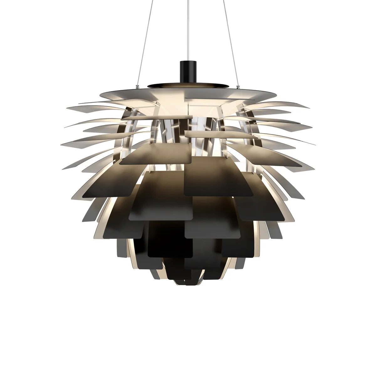 As each row is offset from the previous one, all 72 leaves can "cover" each other, creating an all-round glare-free luminaire whose light source remains concealed from every perspective. The light is transmitted and reflected onto the leaves below, creating a distinctive, unique illumination. The first Artichokes were developed for a restaurant in Copenhagen called Langelinie Pavilion - where they still hang today.