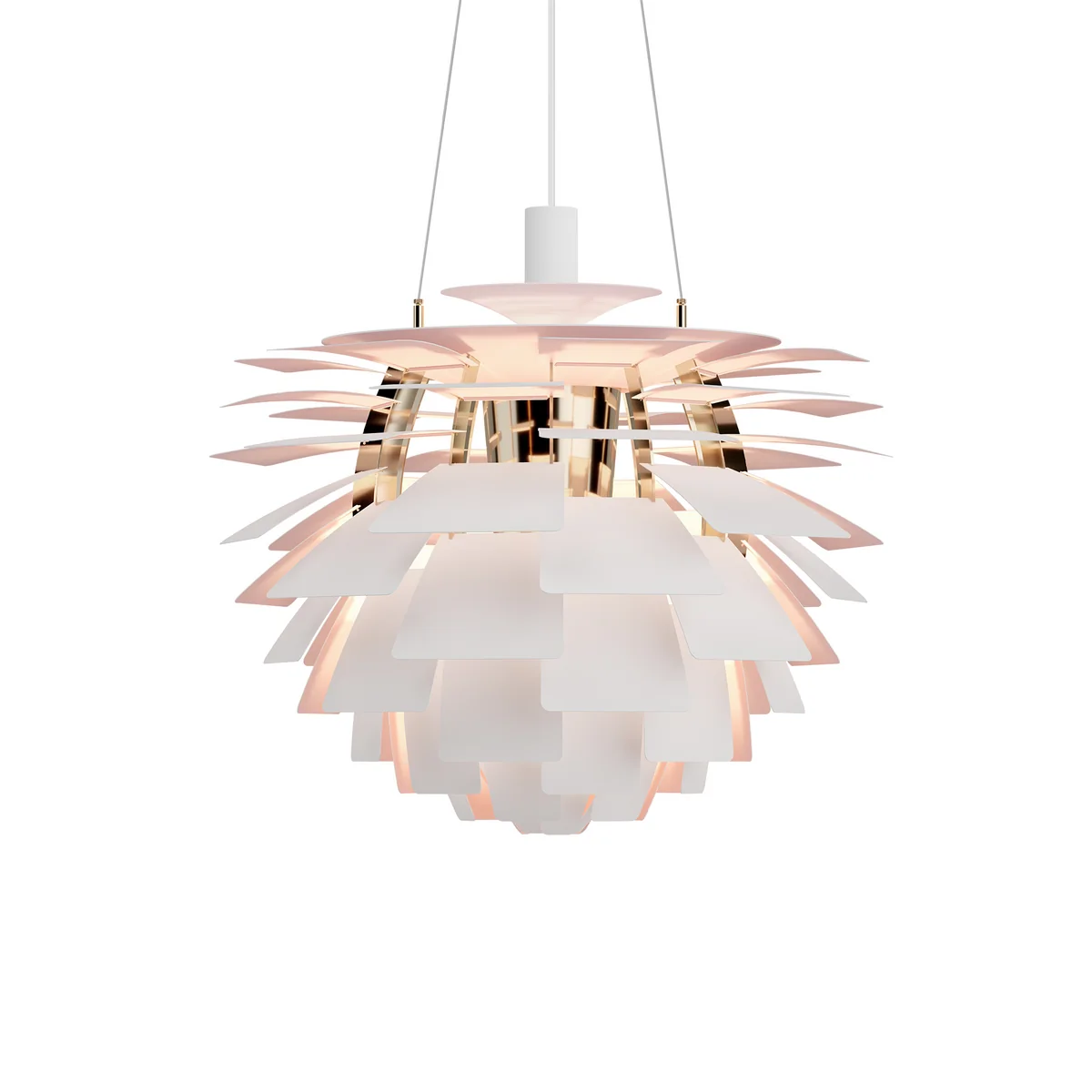 Almost as popular and undoubtedly just as stylistically confident as Henningsen's best-known work, the PH pendant lamp, is the Artichoke with its structure of twelve steel arches. On it, 72 leaves are placed in twelve circular rows, each with six leaves, which in combination are reminiscent of the shape of a cone.