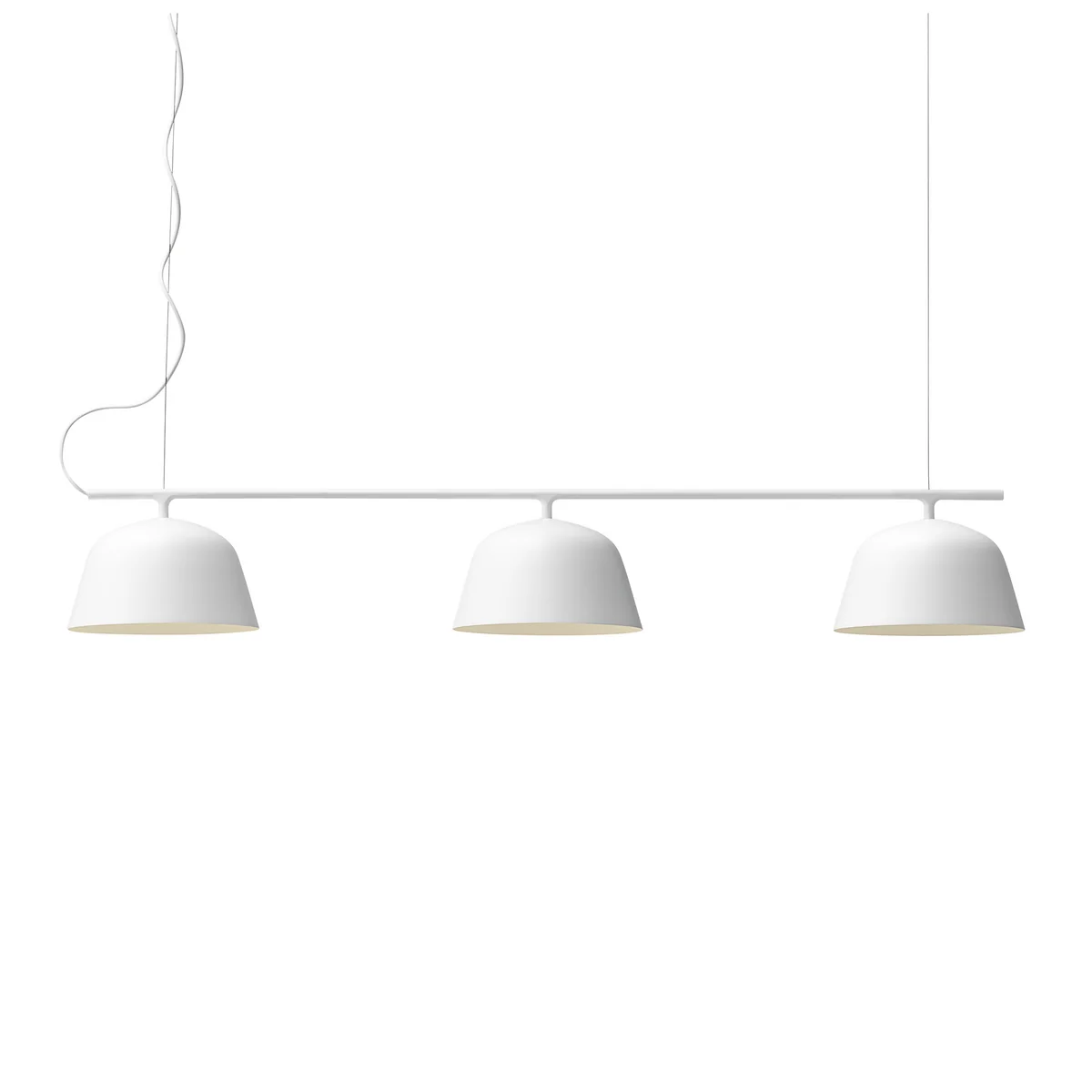 The Ambit Rail suspension by Muuto is a statement pendant lamp that is particularly striking above the dining table, kitchen unit or counter. The lamp designed by TAF Architects consists of a linear rail from which three harmoniously shaped lampshades are hung, ensuring optimum lighting on the surface below.