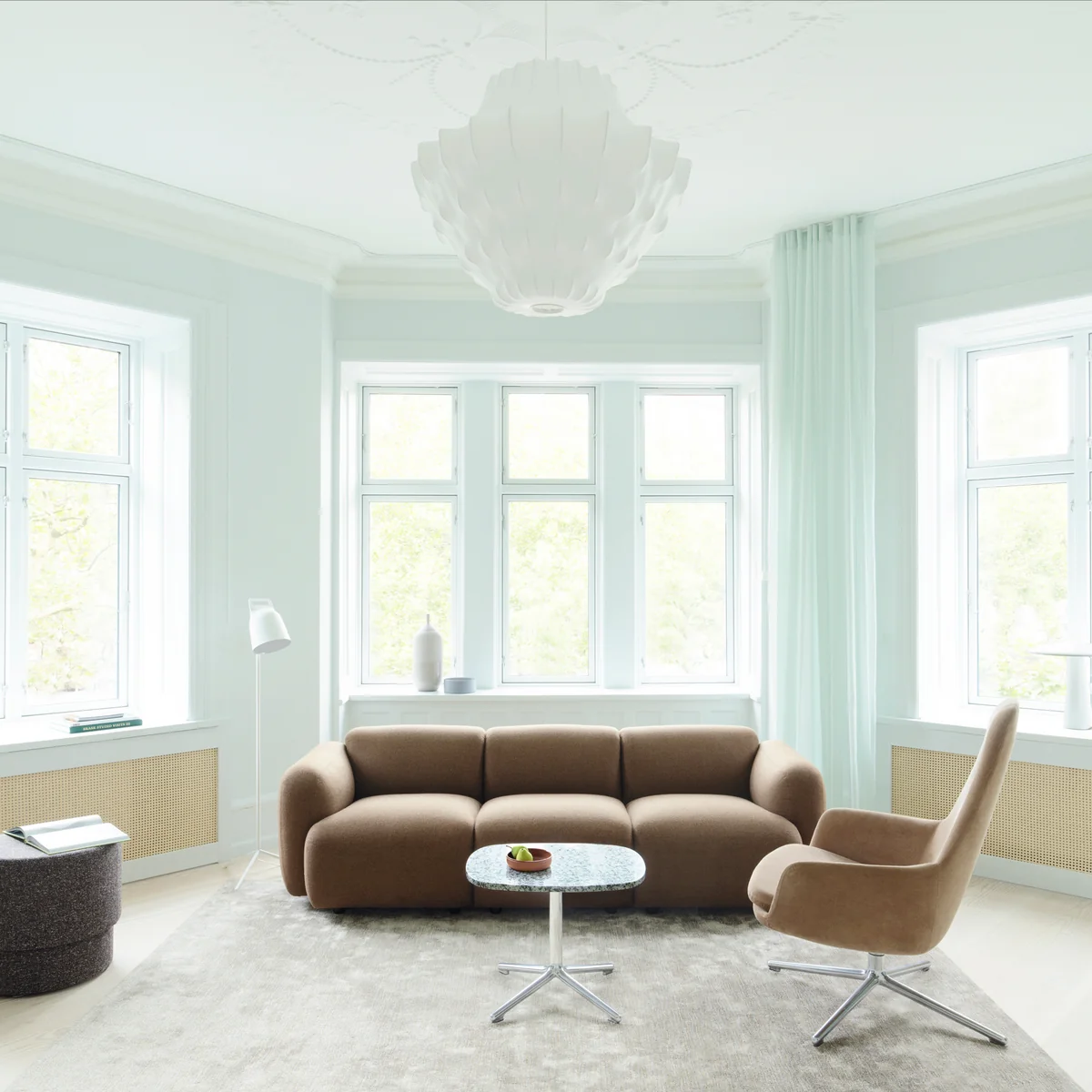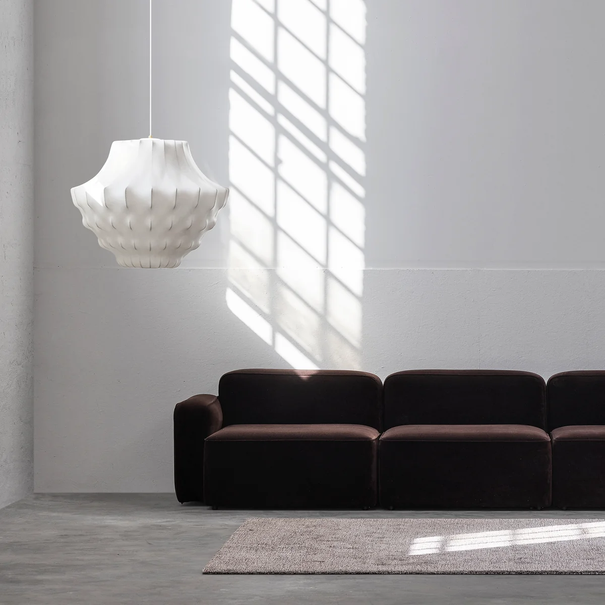 Phantom by Normann Copenhagen is a series of voluminous pendant luminaires made of a special semi-transparent resin material. Simon Legald was inspired by classic chandeliers for the lamps, which take on a soft, iconic expression in the ivory-white veil.