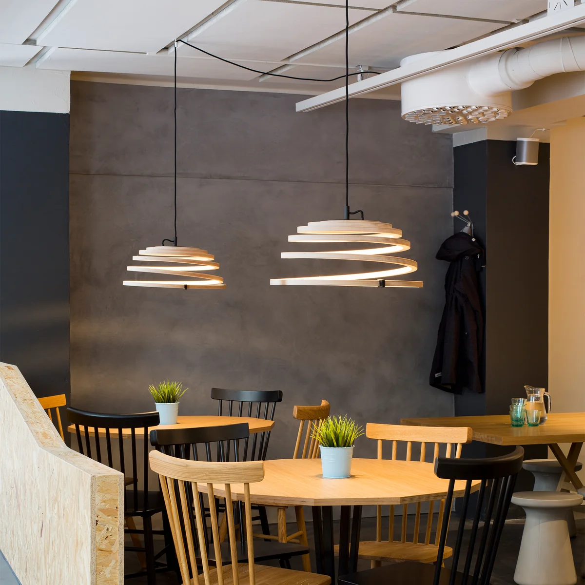 The Aspiro LED pendant luminaire is handcrafted from compression moulded birch wood in Finland. All Secto luminaires are equipped with a Holo sticker, which guarantees the customer an original Secto luminaire. The textile cable, which is available in various colours, also makes the spiral-shaped luminaire a special object in the ambience.