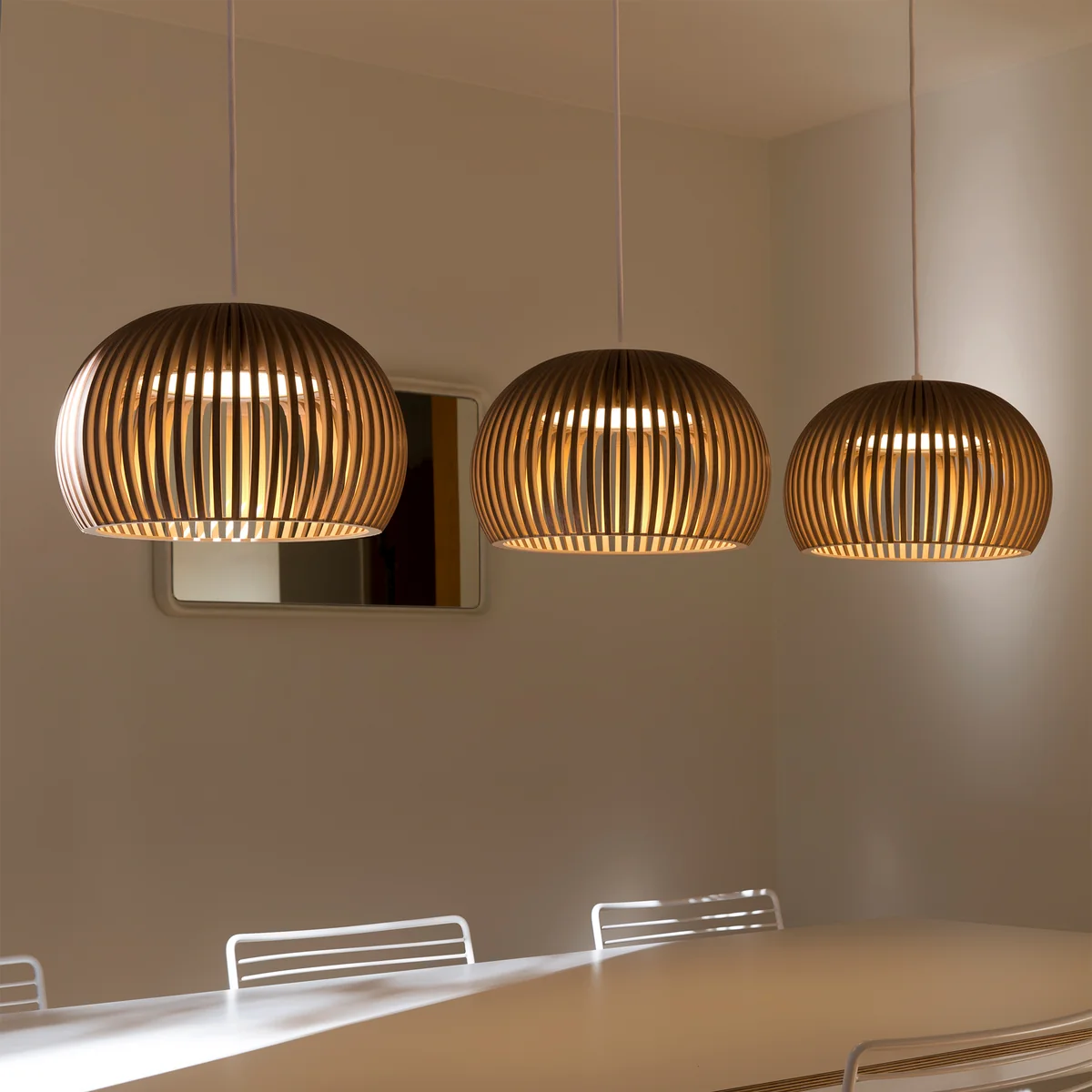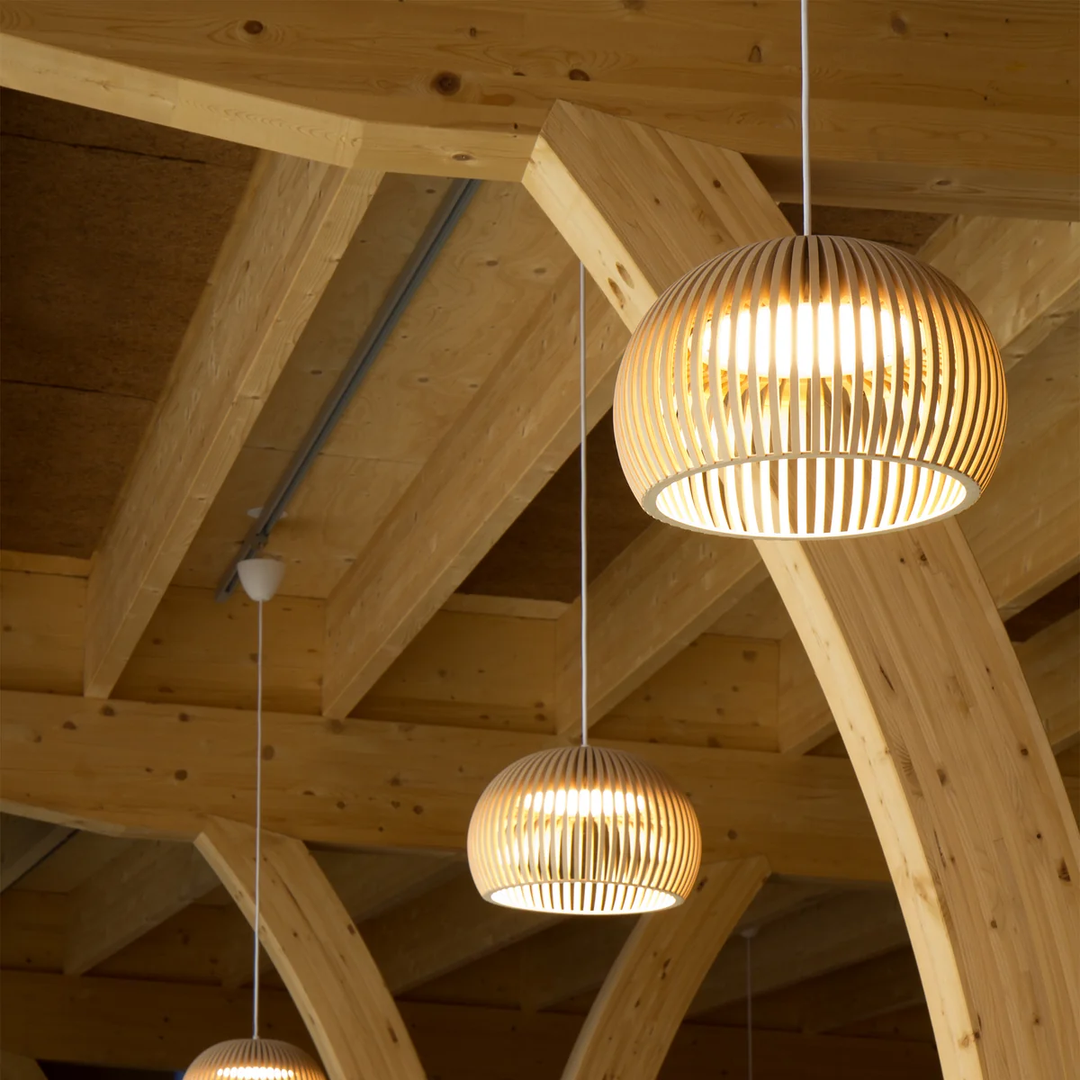 The pendant luminaire is handcrafted from moulded birch wood in Finland. The wood allows the light to shine through gently, creating a pleasant atmosphere and an eye-catcher in the room. In the hallway the Atto pendant luminaire becomes an illuminating source and in the living room a decorative light object above the sofa.
