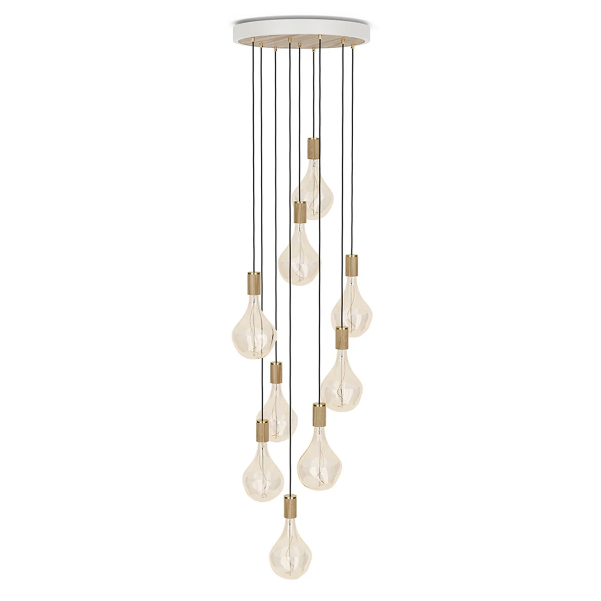 The Nine Luminaire from Tala combines nine distinctive pendant lights with nine striking, sculptural bulbs, all mounted in a large ceiling canopy.