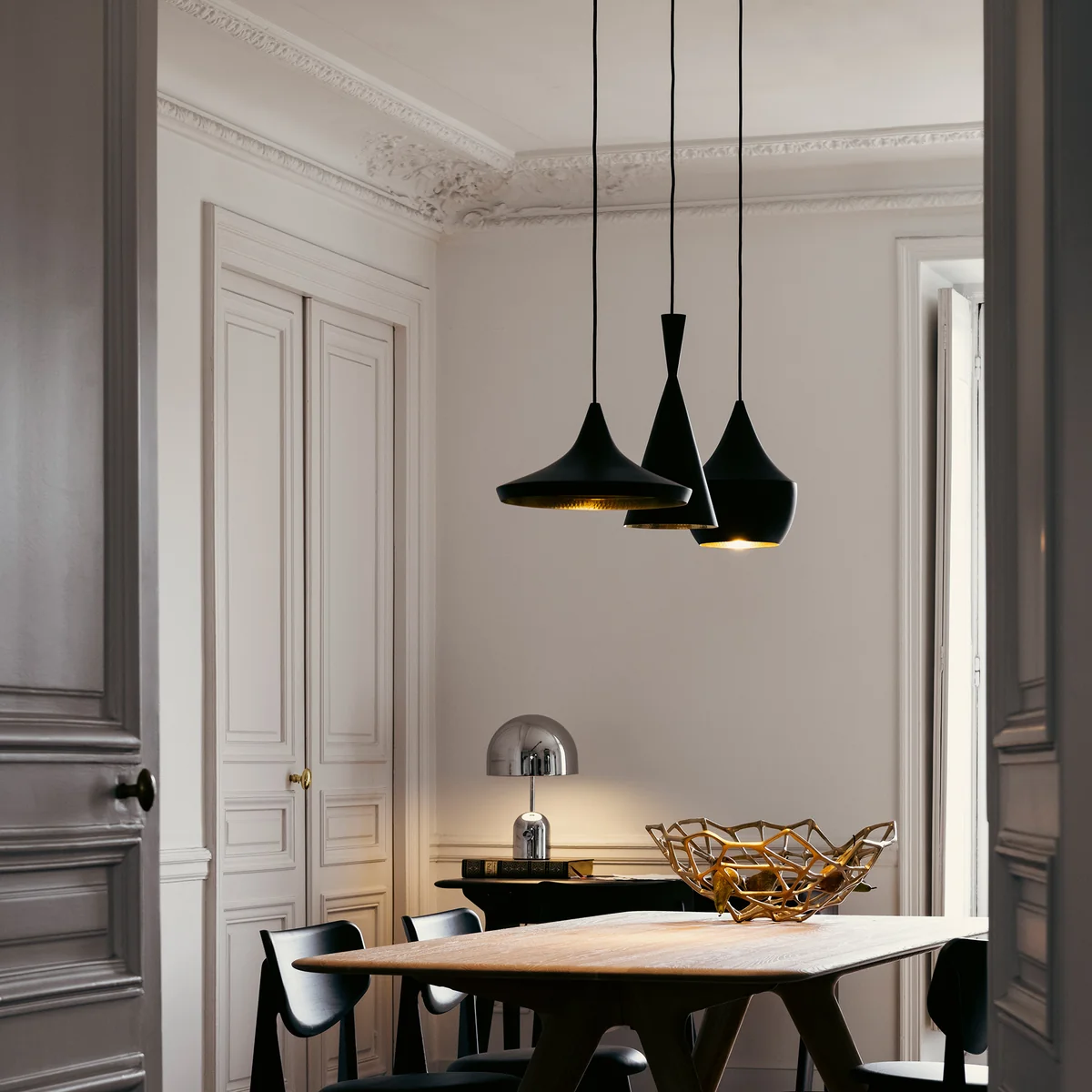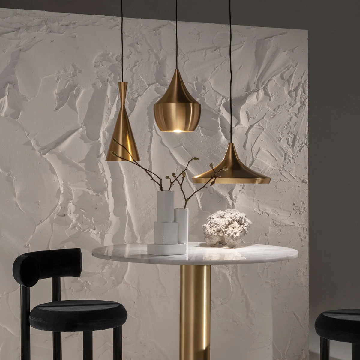 Beat Light is a series of pendant lamps from Tom Dixon. The lamps are hand made out of brass and only later got their black-colored exterior. The Beat Lights differ from one another in the shape of their shades. Beat Light Wide has a flat but soft shade, Beat Light Stout possesses a thick, round shade. Beat Light Fat is small, but compact. And Beat Light Tall is a long funnel-shaped lamp.