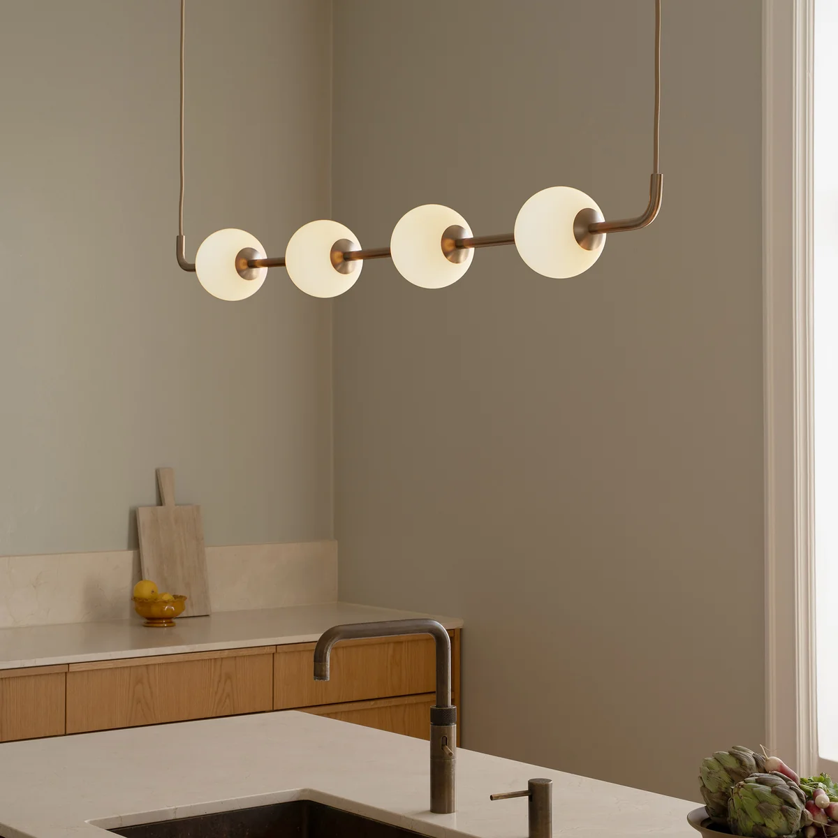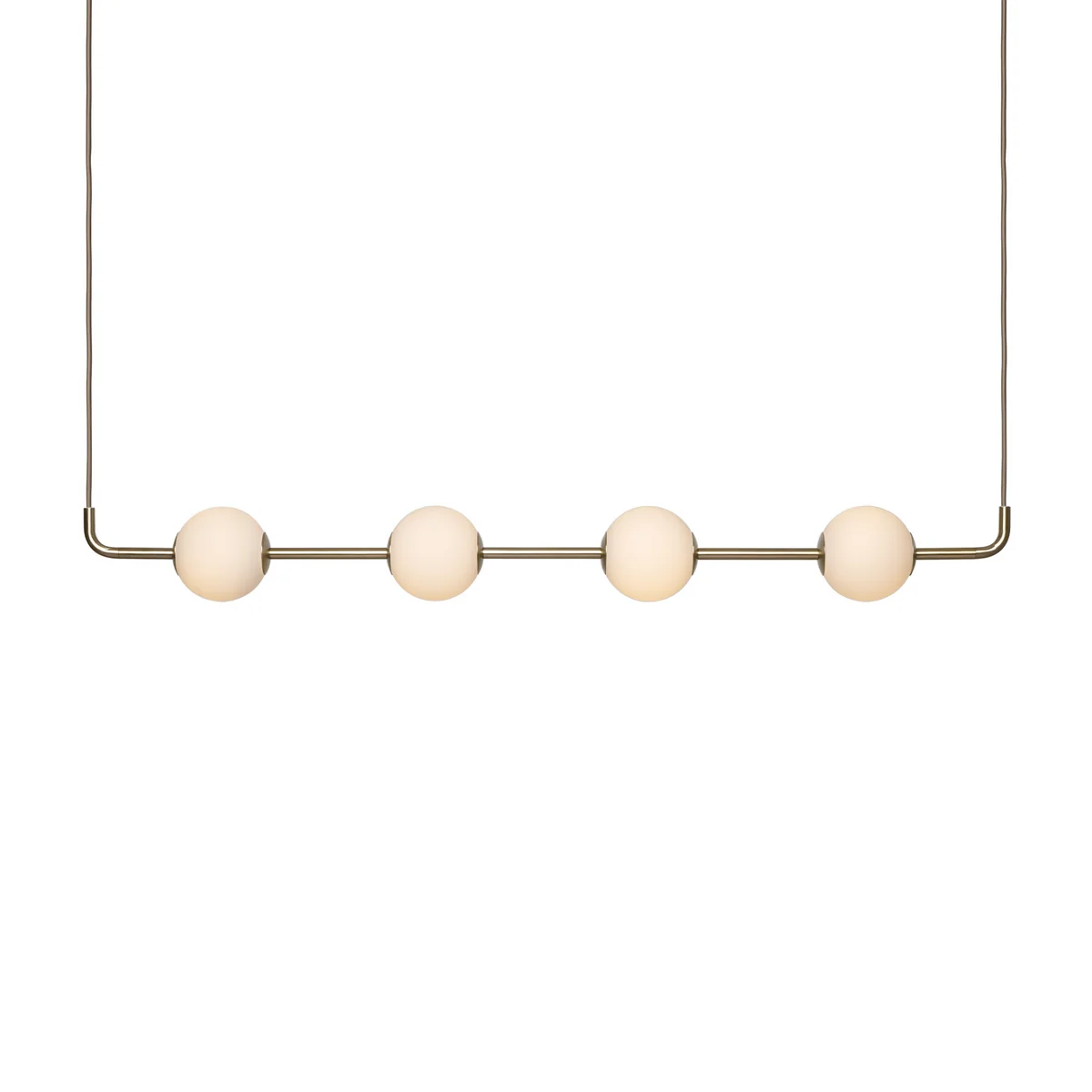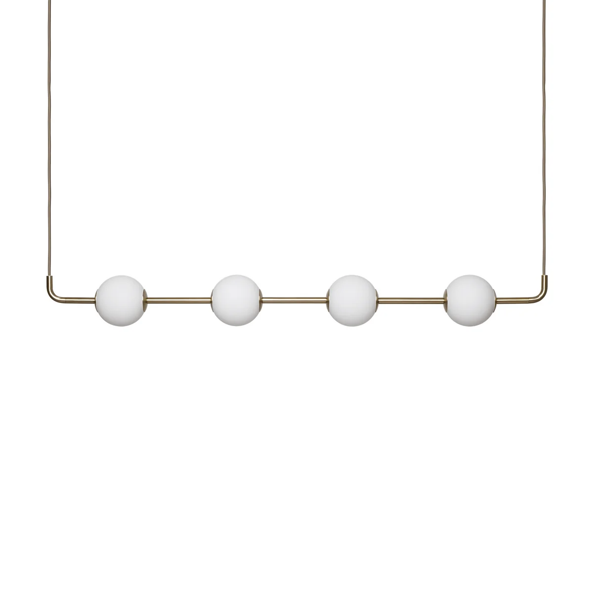 The Audrey Linear pendant light combines sculptural elegance with a soft lighting effect. Four hand-blown opal glass spheres are strung together like pearls on a string and create a warm, calm light that harmoniously illuminates rooms.