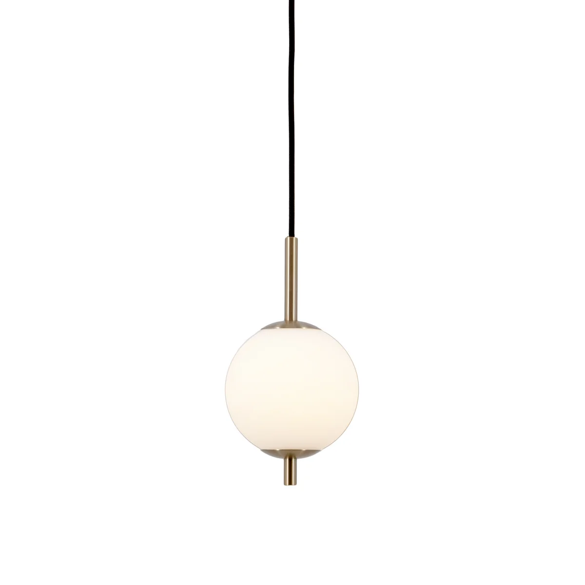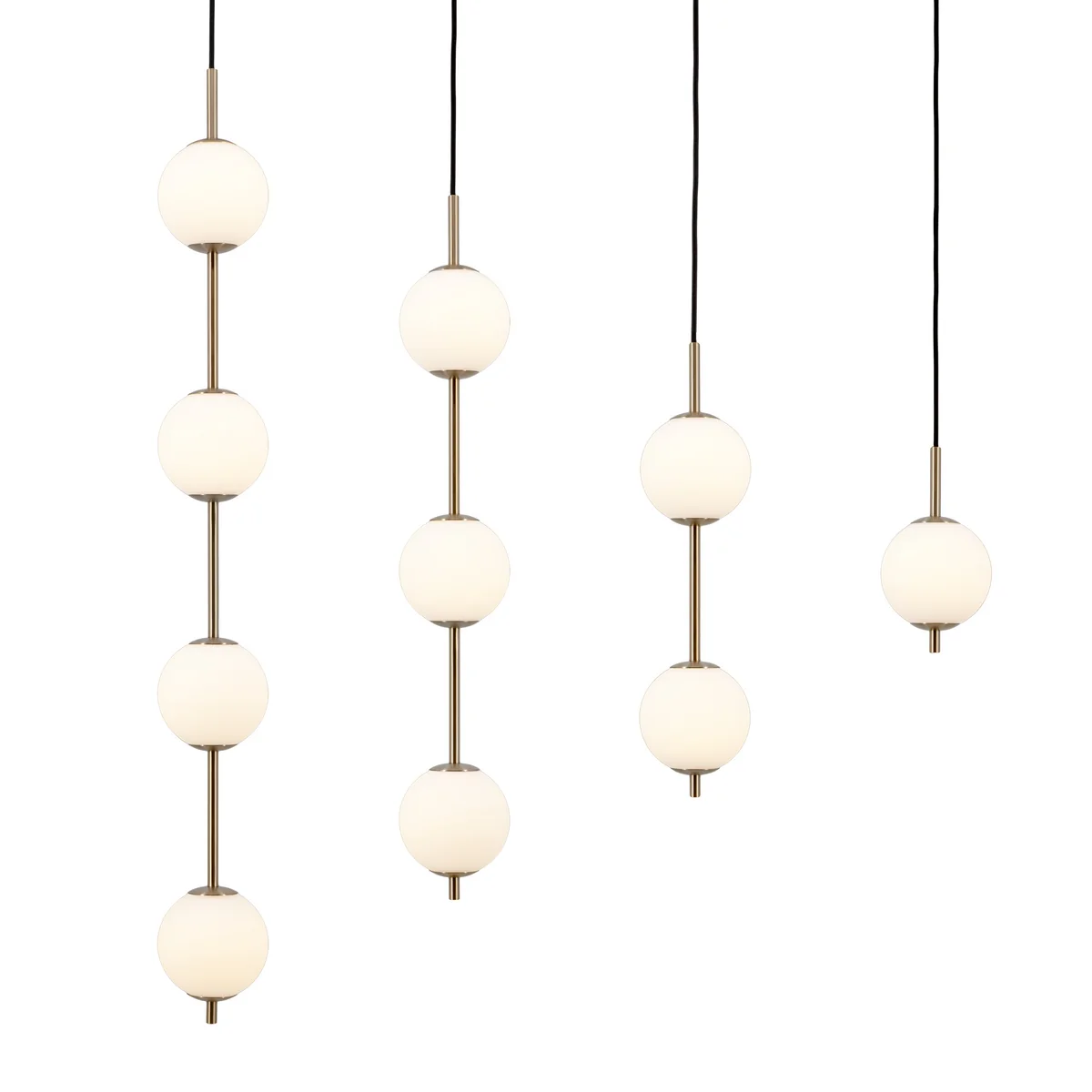 The collection is characterized by its stunning brass accents and hand-blown opal glass spheres, reminiscent of glowing pearls. These delicate spheres gently diffuse light and create a calming atmosphere that invites relaxation and tranquillity.