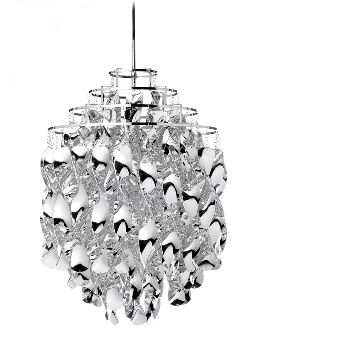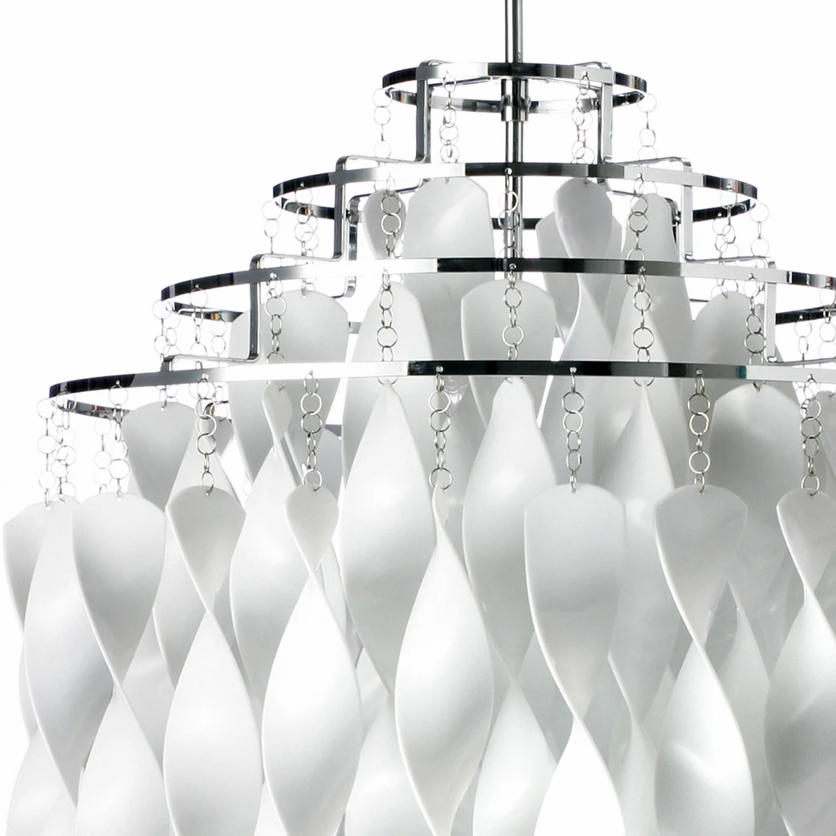 The Spiral luminaire series was designed by Verner Panton in 1969 and is now produced by the Danish company Verpan. The Spiral luminaires are regarded as a further development of the Fun Lamp series, which Panton presented five years earlier (1964). As with the Fun Lamp, Panton uses metal tyres for the Spiral Lamp, to which he attaches movable elements using small metal rings. In contrast to the Fun Lamp, the Spiral Lamp does not use mother-of-pearl or aluminium plates, but spiral-like elements made of plastic. These spirals, which give the luminaire its name, give it a spherical overall appearance because they are suspended on different levels. As with the Fun Lamp, the Spiral Lamp is available as a single luminaire with a metal frame or in cluster formations with one to three "luminaire bundles" arranged one below the other.