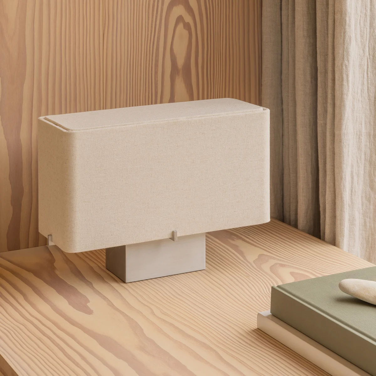 - Sand-colored textile shade and brushed aluminum base for harmonious contrast