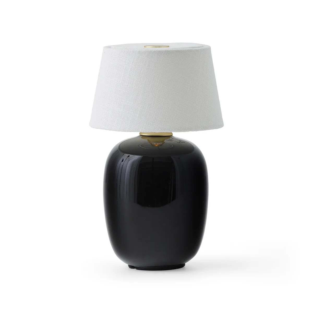 Thanks to the USB rechargeable battery operation, the Torso rechargeable lamp is easy to transport. Made from a ceramic body and a textile lampshade.