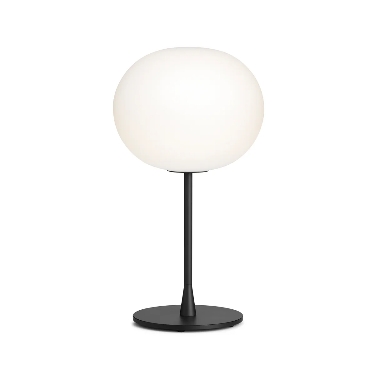 The diffuser of the Glo-Ball Table lamp made of hand-blown opaline glass with etched outer surface and a die-cast aluminium alloy threaded cover ring. The round base is made of black painted solid steel and the narrow shaft is also made of black tubular steel.