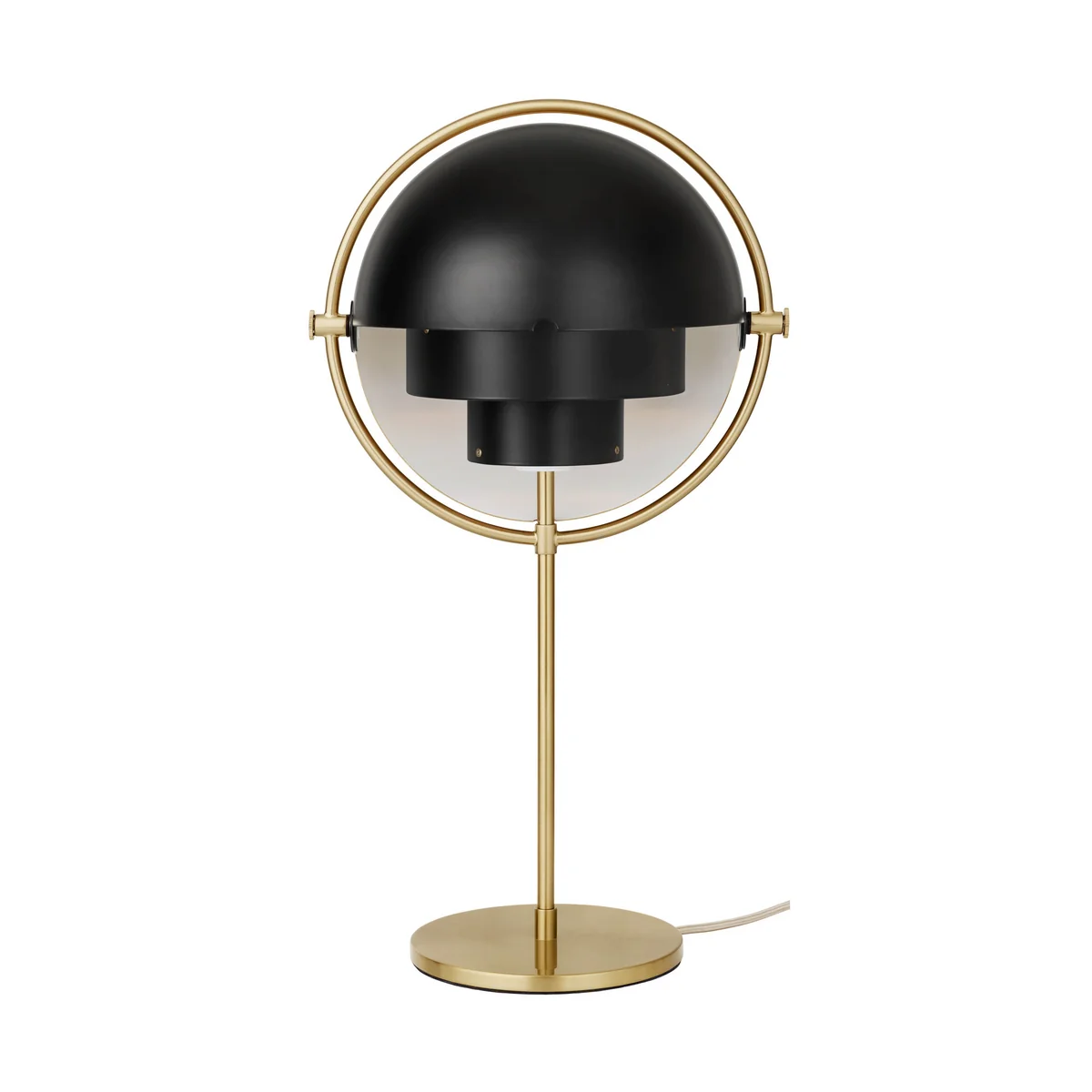 The Multi-Lite Table lamp from Gubi is characterized by its various configuration possibilities, which are due to the design of the shade. With its timeless elegance and decorative features, the table lamp appears almost sculptural. Two cylindrical shapes form the foundation of the lampshade, while two quarter-spherical shades are freely adjustable. The construction is held in place by a metal ring. Due to the flexible arrangement of the shades, the light is always directed in different directions so that it radiates either downwards, upwards or as asymmetrical artificial light. The luminaire thus adapts to any purpose and can function both as a work light on the desk and as an ambient light on the sideboard.