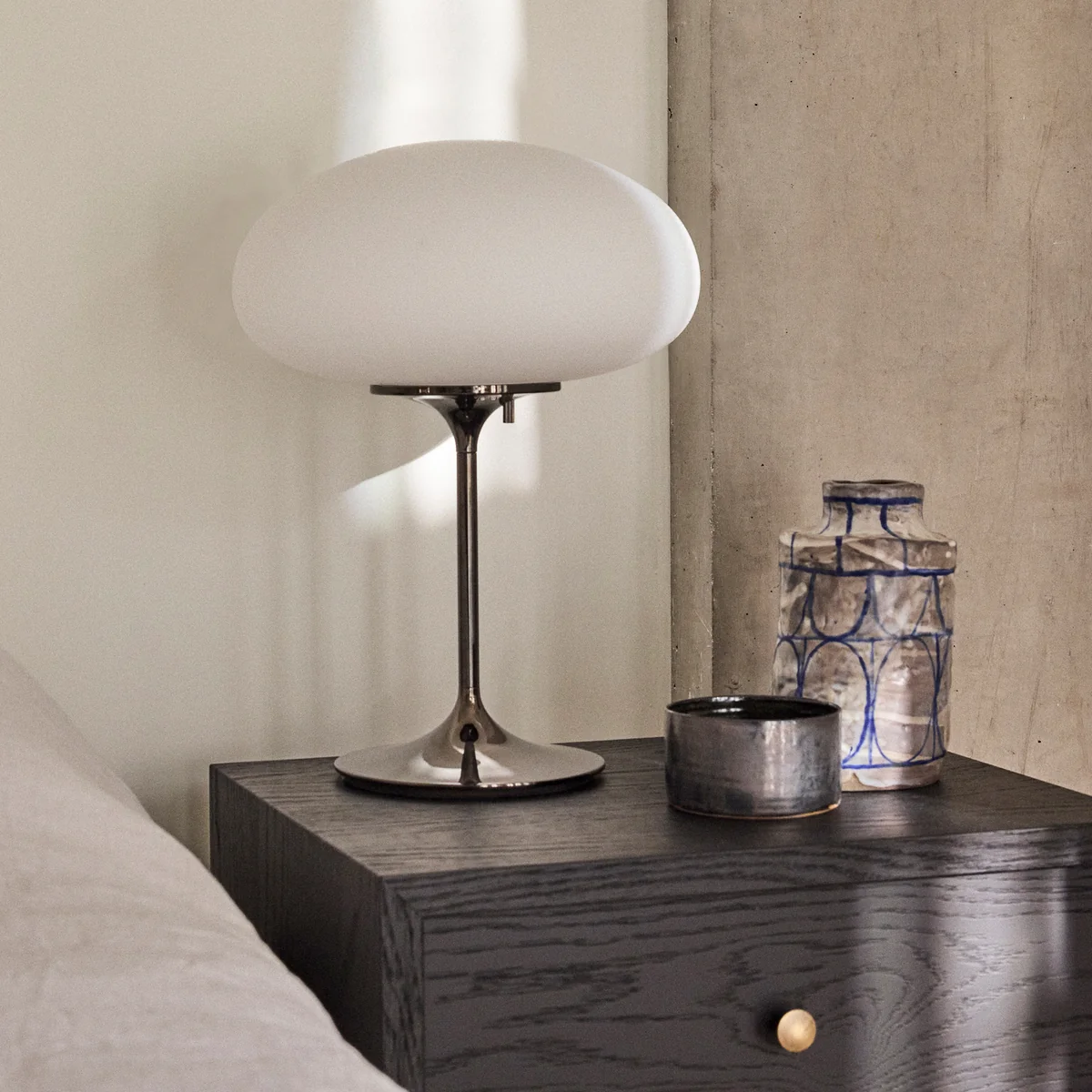 With its height of 42 cm, the Stemlite table lamp is ideal for sideboards, bedside tables or desks. The opal glass body provides a soft, evenly diffused light, while the organic shape creates a timeless balance between futuristic elegance and homely warmth.