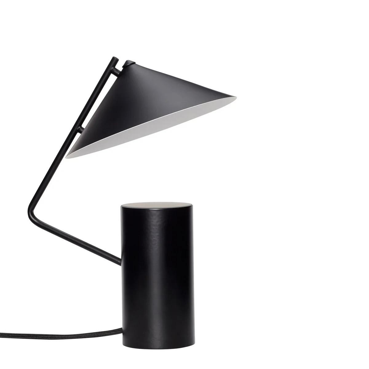 This metal table lamp by Hübsch Interior is characterized by a sculptural expression. Its shade is connected to a cylindrical base by an angled metal rod, which gives the impression that the lamp consists of two separate parts.