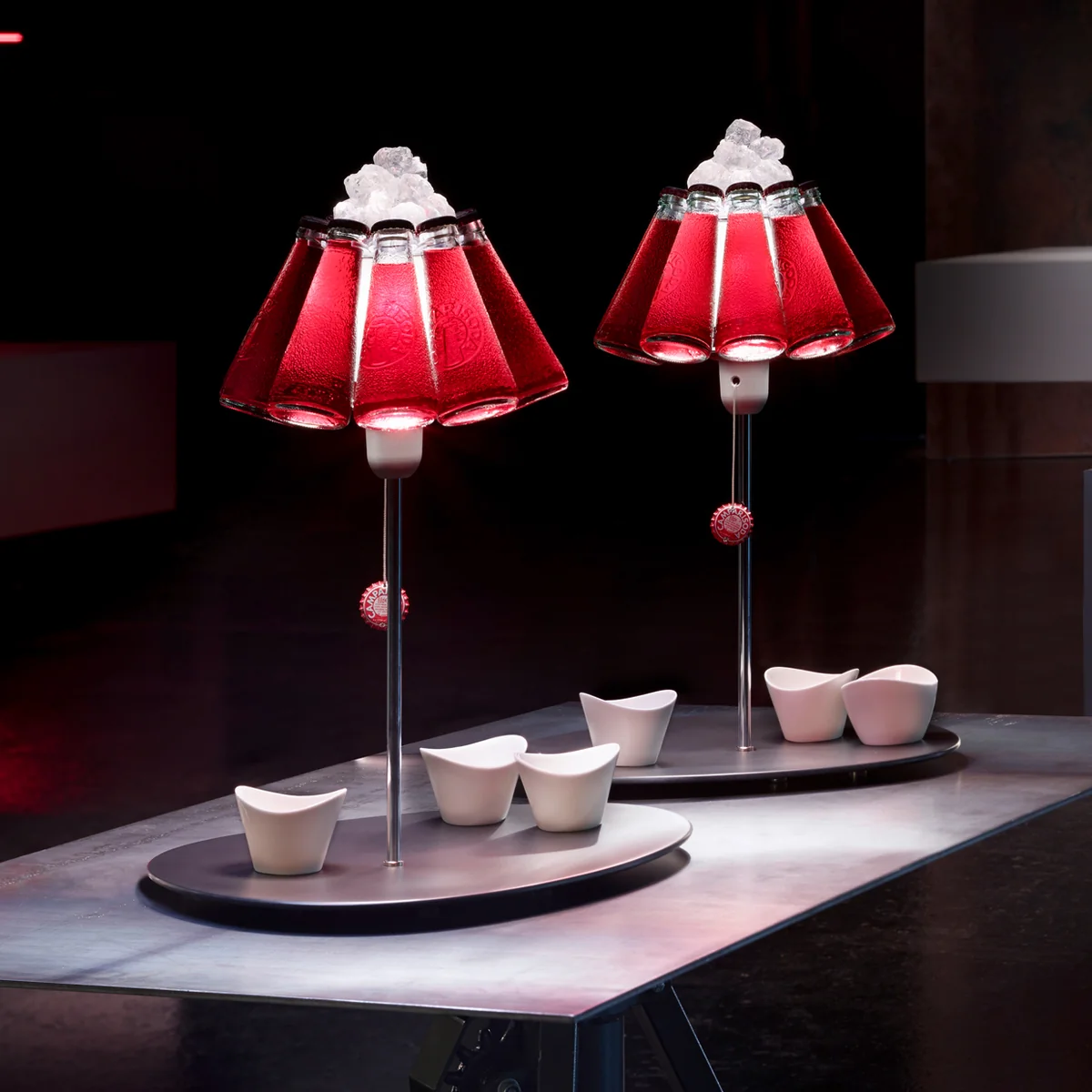 The base of the lamp is made of plastic, the stand is made of metal, the ice cubes are made of glass and the shade is made of original, removable and replaceable Campari bottles. The cable is transparent.