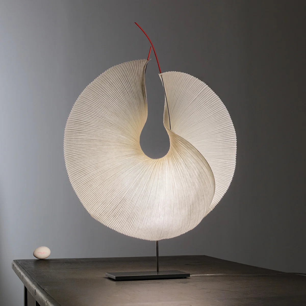 The Yoruba Rose LED table lamp of Ingo Maurer enchanted by delicate grace and perfection. Its light design and the warm, soft light make it the ideal lamp for rooms where you want to relax. Like a blossom striving upwards, the bow of Japanese paper stretches out on the thin metal wires, creating a three-dimensional effect. The red details at the upper end resemble a scar of a flower and give the design object elegance.