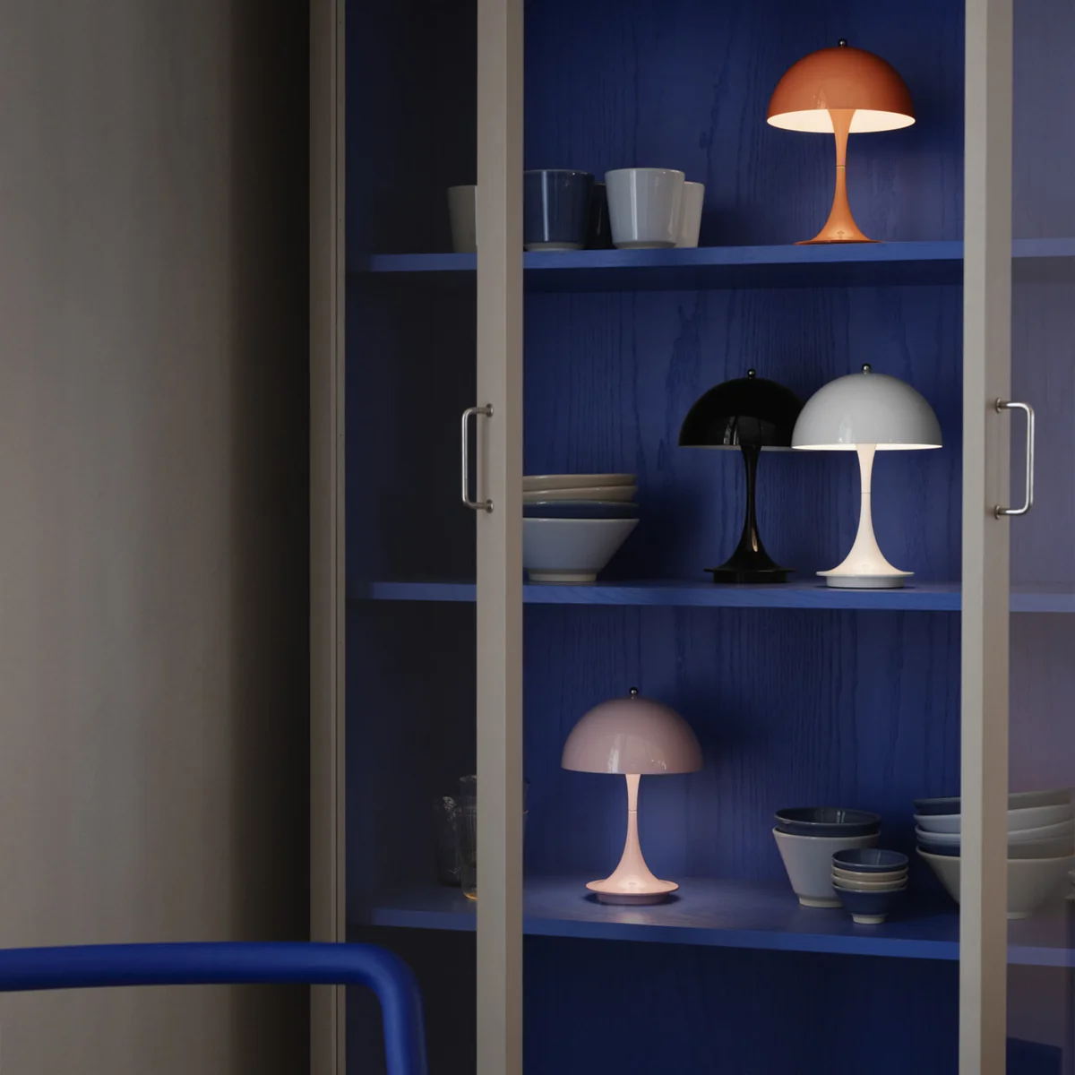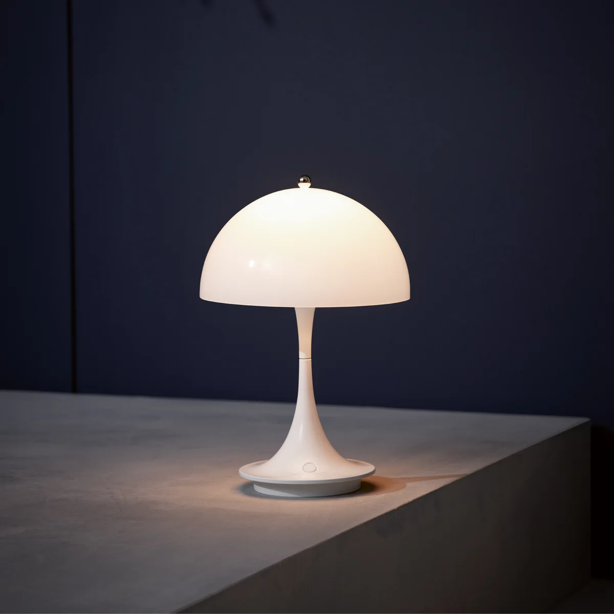 Panton wanted to create a luminaire in which not only the shade but also the base serves as a reflector. The portable luminaire is manufactured with a shade made of injection-molded acrylic and a base made of die-cast aluminum. Alternatively, there is also a choice between versions made entirely of metal or acrylic with an aluminum base. The light can be charged wirelessly or via a USB connection. This means it can be used wonderfully on the balcony or in the garden and provide light wherever there is no socket available. The light can also be dimmed in three stages.