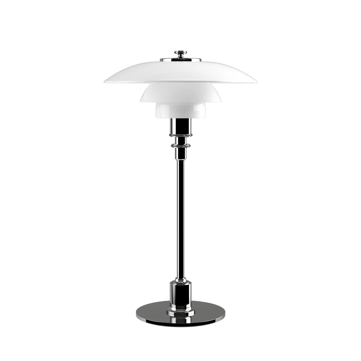 The small PH 2/1 table lamp was designed based on the principle of a reflective three-shade system that directs most of the light downwards. The three shades are made of mouth-blown opalized three-layer glass by Louis Poulsen . The shades are glossy on the inside and sandblasted on the outside, resulting in a soft and diffuse light distribution. The base is optionally available in drawn aluminium in high-gloss chrome-plated, brass or black metallized. The textile cable is black.