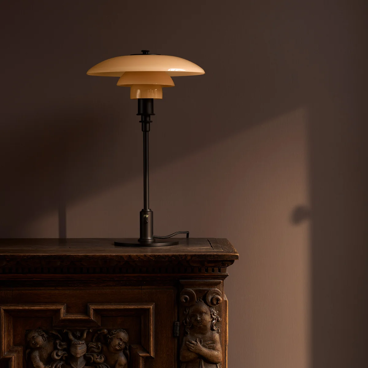 The PH 3/2 Dusty Terracotta Table Lamp - Limited Edition 2025 brings the classic 3-shade design by Poul Henningsen to the table in a new, warm color scheme. The lamp body is made of mouth-blown, four-layer glass in a rich terracotta shade with a sandblasted white underside. The ensemble is complemented by brushed, aged brass with fine hairlines and sophisticated details such as the metal pass-through switch, the dark textile cable and the discreetly engraved PH initials.