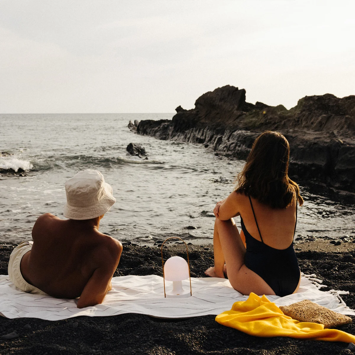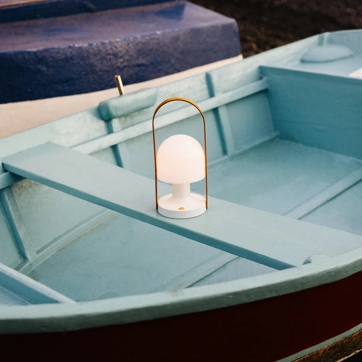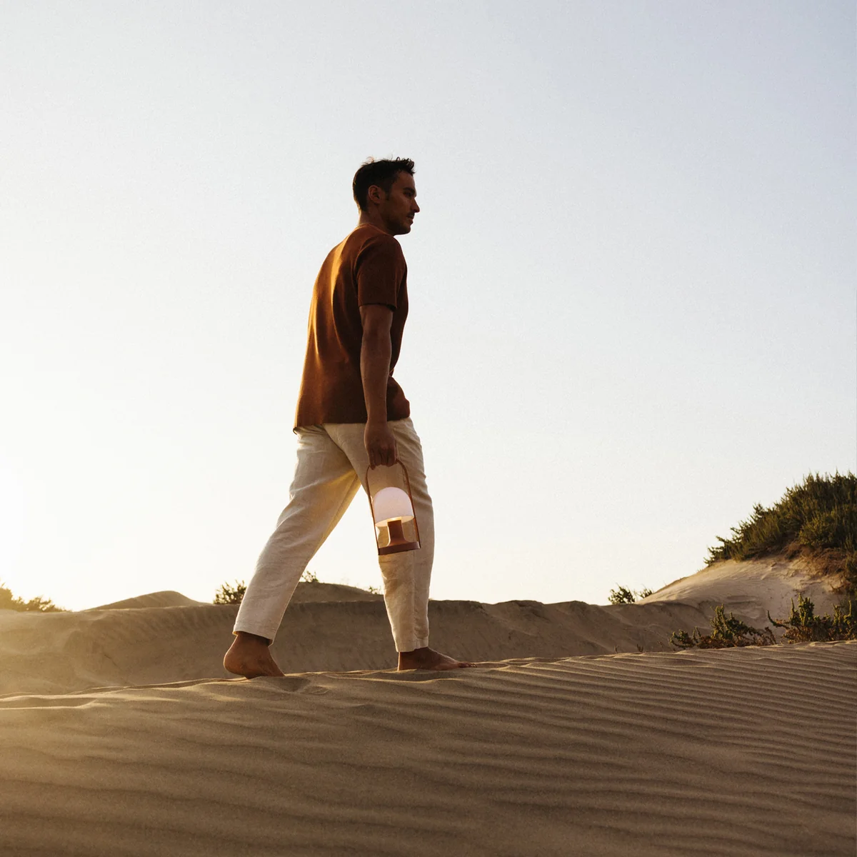Opal diffuser and body in white matte polycarbonate. Handle in plywood and brass. Five hours of battery life at maximum power.