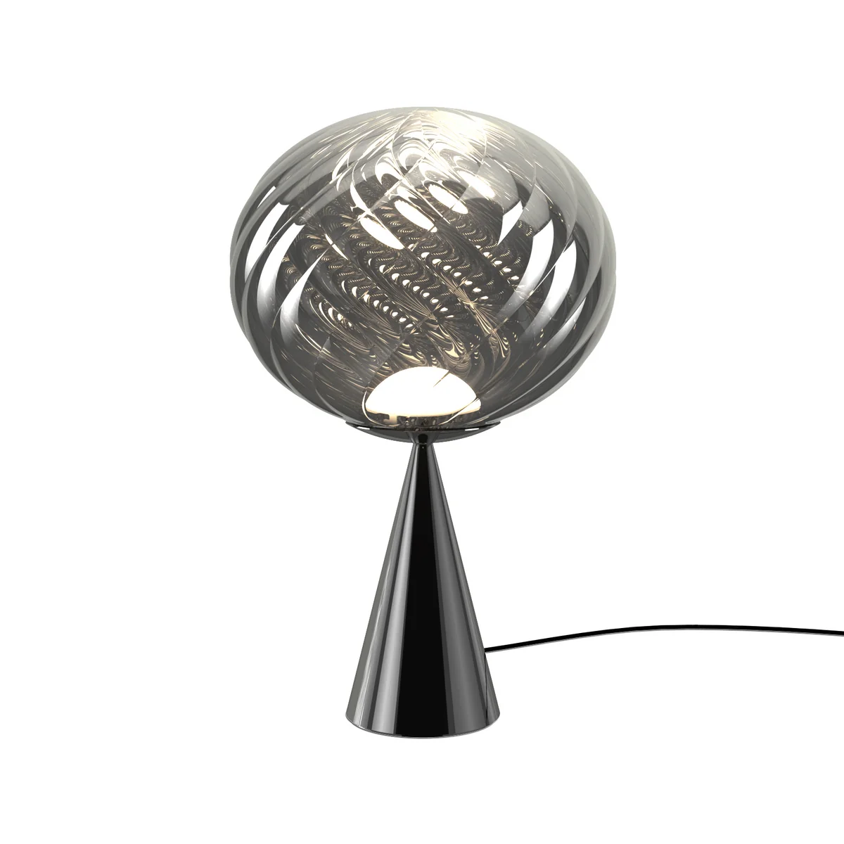 The Whirl Cone Fat table lamp from Tom Dixon combines artistic design with technical sophistication. Its striking, conical base and organically curved reflector form a sculptural object that both illuminates and fascinates. The light is softly diffused and emphasizes the craftsmanship and depth of material that is typical of Tom Dixon s designs. Expressive design object for table, sideboard or bedside table.