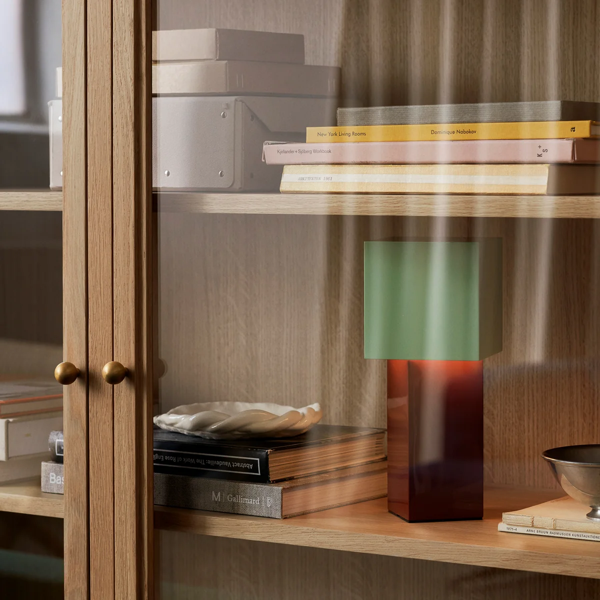 The Pivot Portable ATD7 battery lamp from & Tradition combines sculptural design and radiant light. The geometric shade of the lamp is positioned at a 45-degree angle to the base. The warm glow of the light is reminiscent of atmospheric candlelight. A wonderfully inviting ambience can be created at the touch of a button.