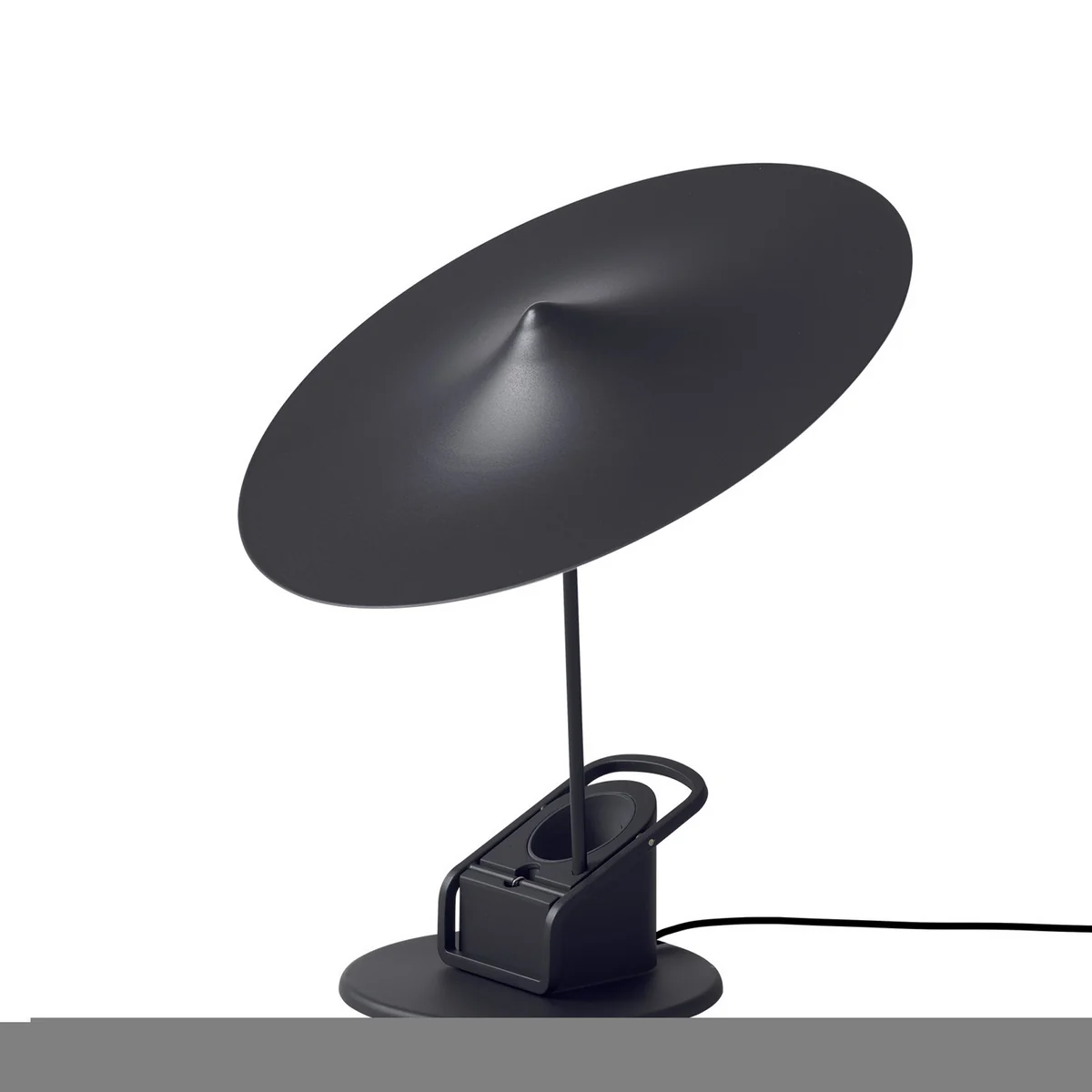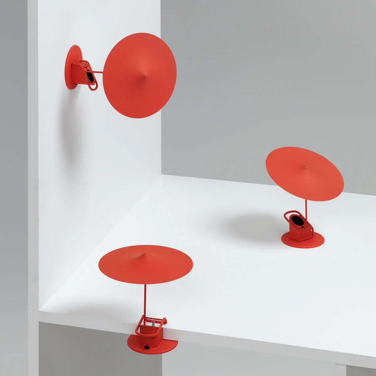 On the basis of these clamp lamps, Sempé developed a multi-purpose lamp which, in addition to its clamp function, also functions as a table lamp and can be fixed to the wall. The luminaire is made of aluminium and powder-coated steel and is available in various colours. The construction consists of a circular base, which ensures a firm stand, and a conical lampshade, which is adjustable and distributes the light of the LED lamp in a gentle way in the room.