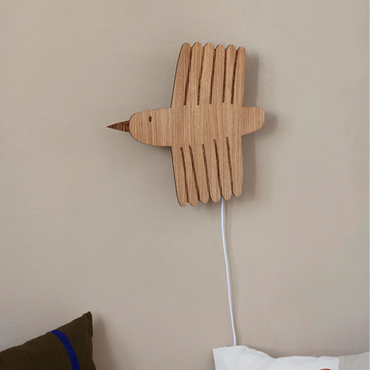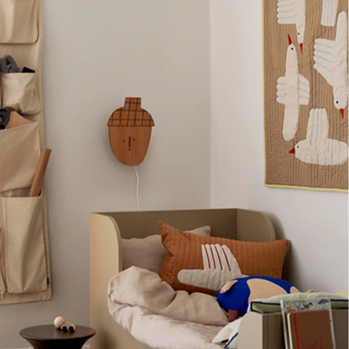 The children's wall lamp from the house of Ferm Living inspire with their natural, organic look. They provide a soothing atmosphere and an extremely pleasant, soft light. The lampshade is made of oiled oak veneer, the details are engraved with a laser. The lamp can be easily mounted on the wall next to the bed to provide an optimal night light. Can be combined with two G4 LEDs and max. 2x3 W. The LEDs are not included. 1.90 m long cable available.