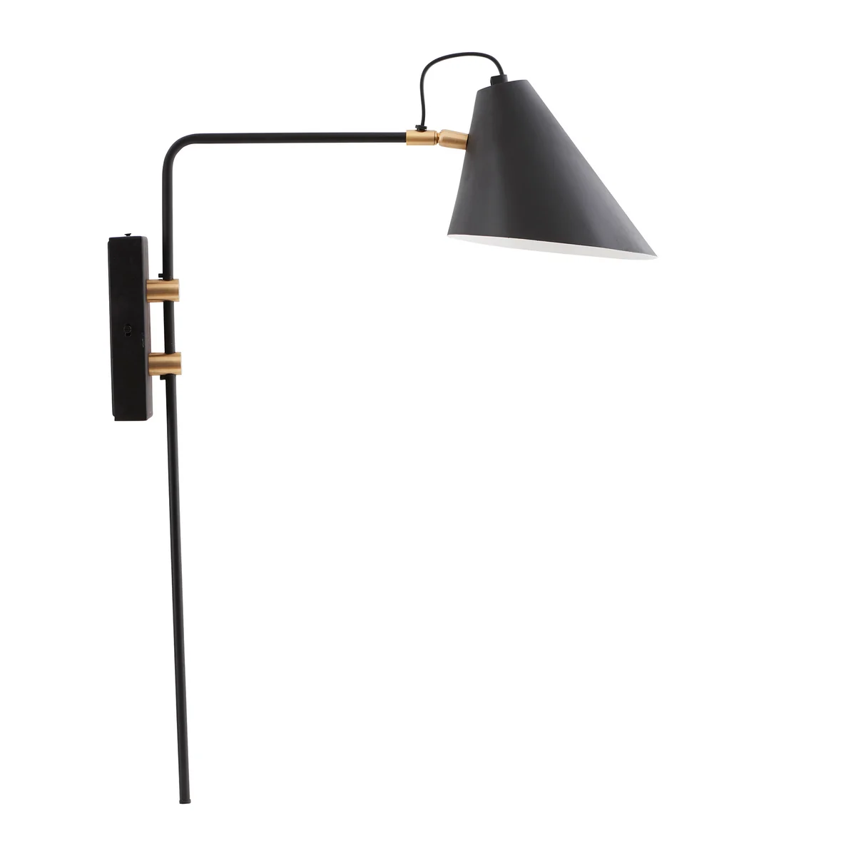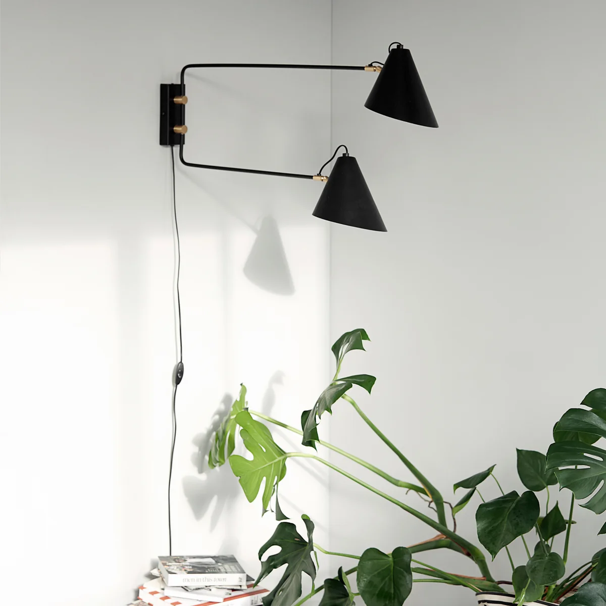 The adjustable Club wall lamp by House Doctor is equipped with one or two articulated arms and always provides light exactly where it is needed. At the end of the articulated arm is a conical lampshade made of lacquered iron, which emits light directed downwards. The connecting elements made of brass set shiny accents and additionally emphasize the industrial charm.