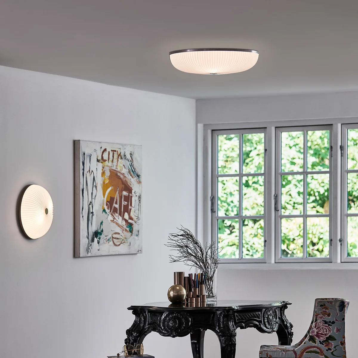 The luminaire is made of plastic and is available in various diameters. Details in silver or gold round off the design and create a timeless light that becomes an eye-catcher. Lamella is a practical and beautiful lighting solution, both alone and in different sizes with several on the wall or ceiling.