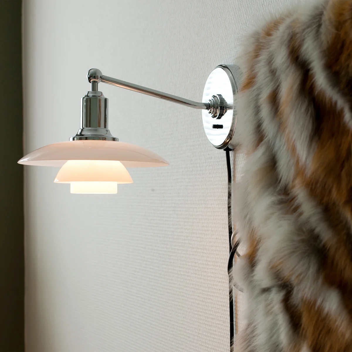 The PH 2/1 wall lamp by Louis Poulsen is made of mouth-blown opal glass, arm and bracket are made of high-gloss chrome-plated aluminium and brass.