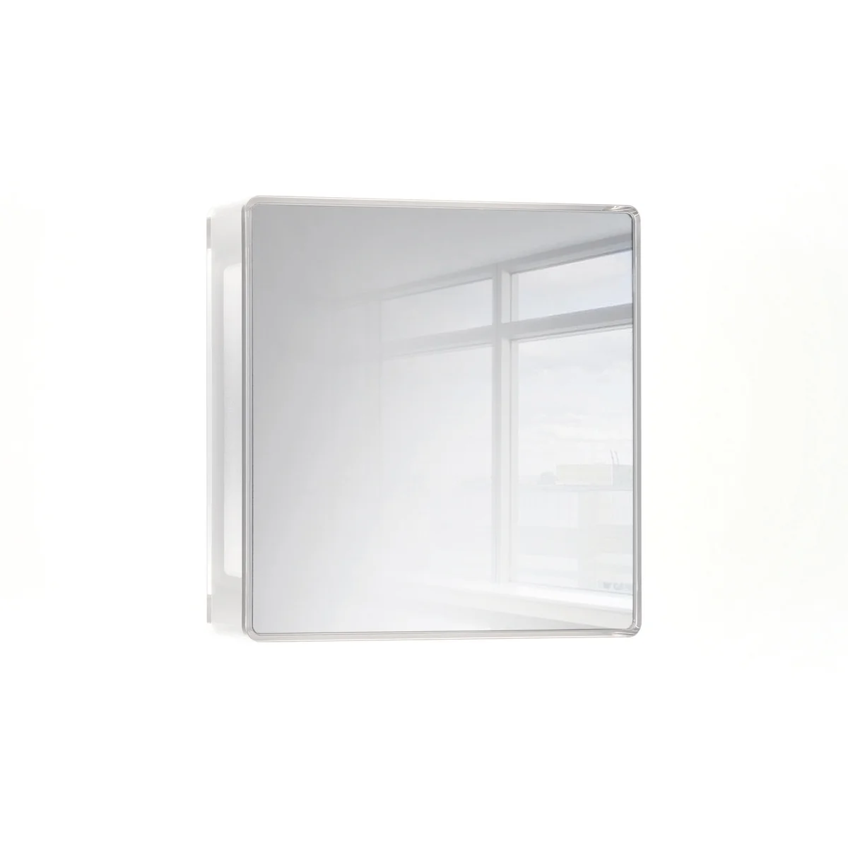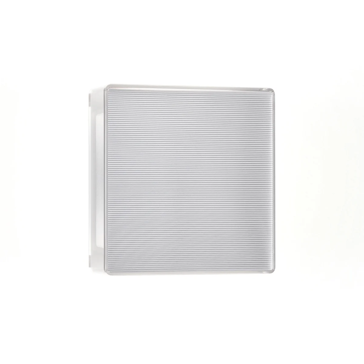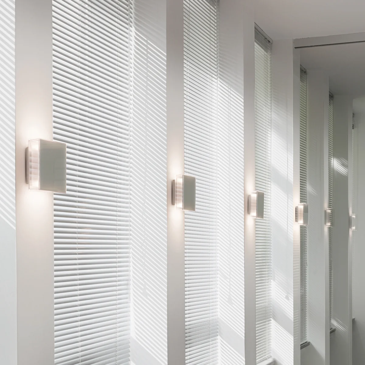 The App wall lamp consists of an aluminium frame, a polycarbonate shade and a Plexiglas or glass front in many different versions. Energy-efficient technology is contained in two high-intensity LED boards. These emit intensive light symmetrically upwards and downwards, reflecting into the room via the wall, ceiling and floor. The light falling laterally through the cuboid, on the other hand, is gently scattering and glare-free. The colour of the front surface has no influence on the light intensity.