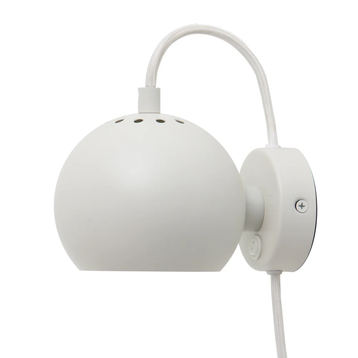 The wall lamp designed by Benny Frandsen Ball Wall lamp made of metal and has a textile cable. The on and off switch is integrated into the wall mount. It is available in a variety of different colors.