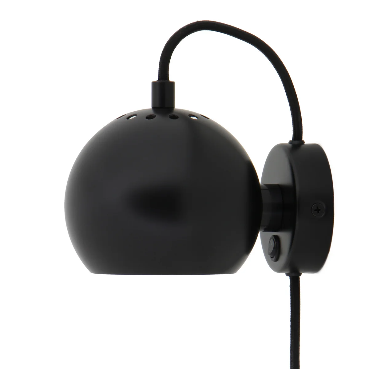 The wall lamp designed by Benny Frandsen Ball Wall lamp made of metal and has a textile cable. The on and off switch is integrated into the wall mount. It is available in a variety of different colors.