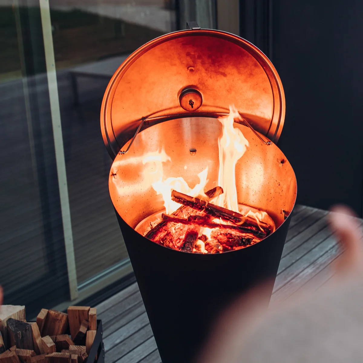 Cone can be converted into a fire pit after barbecuing as the bottom grid can be lifted up to the edge of the funnel. A great atmosphere can already be created with very little wood when it is in the highest position, finishing the barbecue evening in a warm and cosy way.