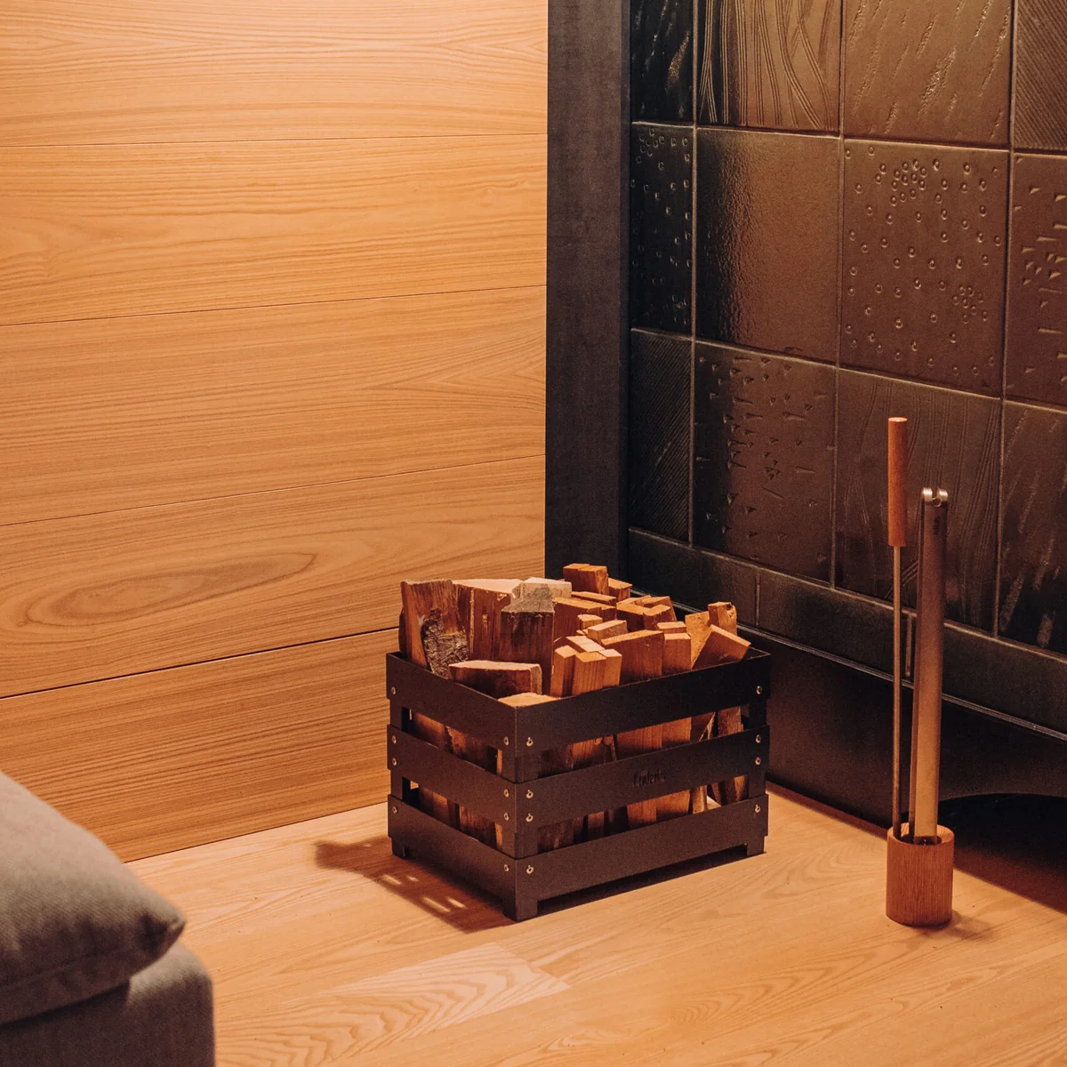 The poker can be used to place and stoke the wood or charcoal pieces as desired. With the integrated flame blower tube, the tool becomes an indispensable all-rounder. The robust fire tongs can be used multifunctionally. The wooden base provides the perfect shelf for the helpers un d rounds off the harmonious design. It can be placed next to any fireplace or stove, so that the tools are always within reach.