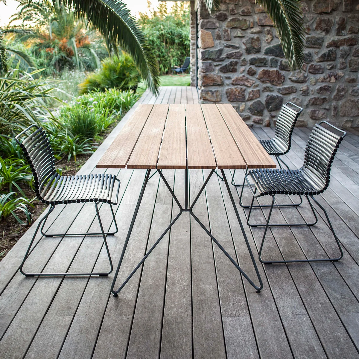 The CLICK Outdoor Dining chair from HOUE impresses with its simple, honest and ergonomically well thought-out design. Without armrests or optionally with armrests, it presents itself as a harmonious element that is repeated around the table, creating a harmonious overall look. The innovative plastic slats are precisely designed - thanks to the optimum balance of firmness and flexibility, they offer outstanding seating comfort even without upholstery. Particularly practical: the slats can be easily exchanged with a click, allowing you to customize the appearance of the chair or mix different colour combinations. The CLICK Dining Chair is available in 11 attractive colors and also impresses with its stackable design, which makes it ideal for everyday use.