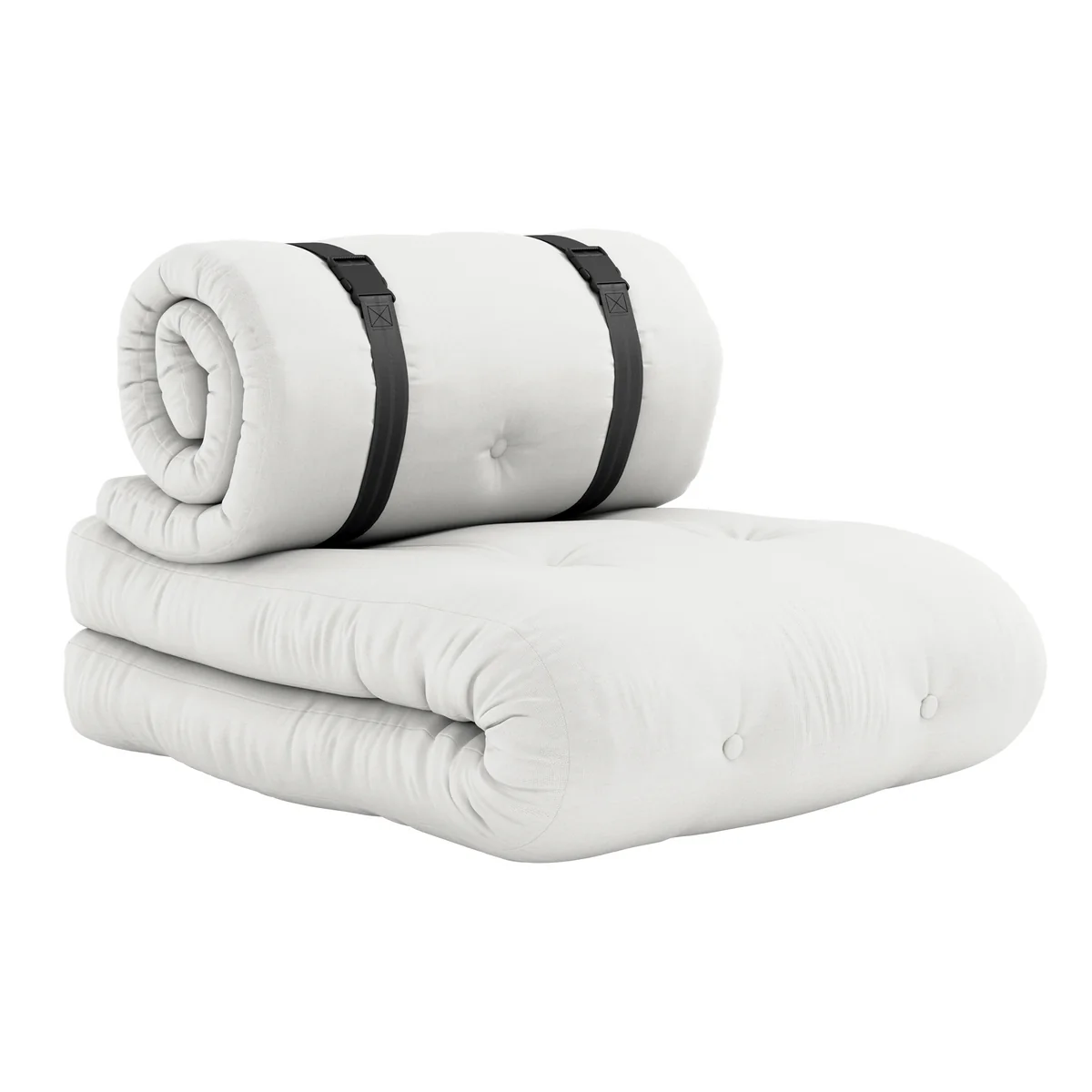 The Buckle Up OUT Chair by Karup Design invites you to relax in the sun and can also be used for a little nap if required. It consists of two mattresses, one folded to serve as a seat and the other rolled up and tied with straps as a backrest. If you release the straps and roll out the backrest on the thick mattress, you create a comfortable outdoor bed measuring 200 x 70 cm, on which you can relax comfortably.