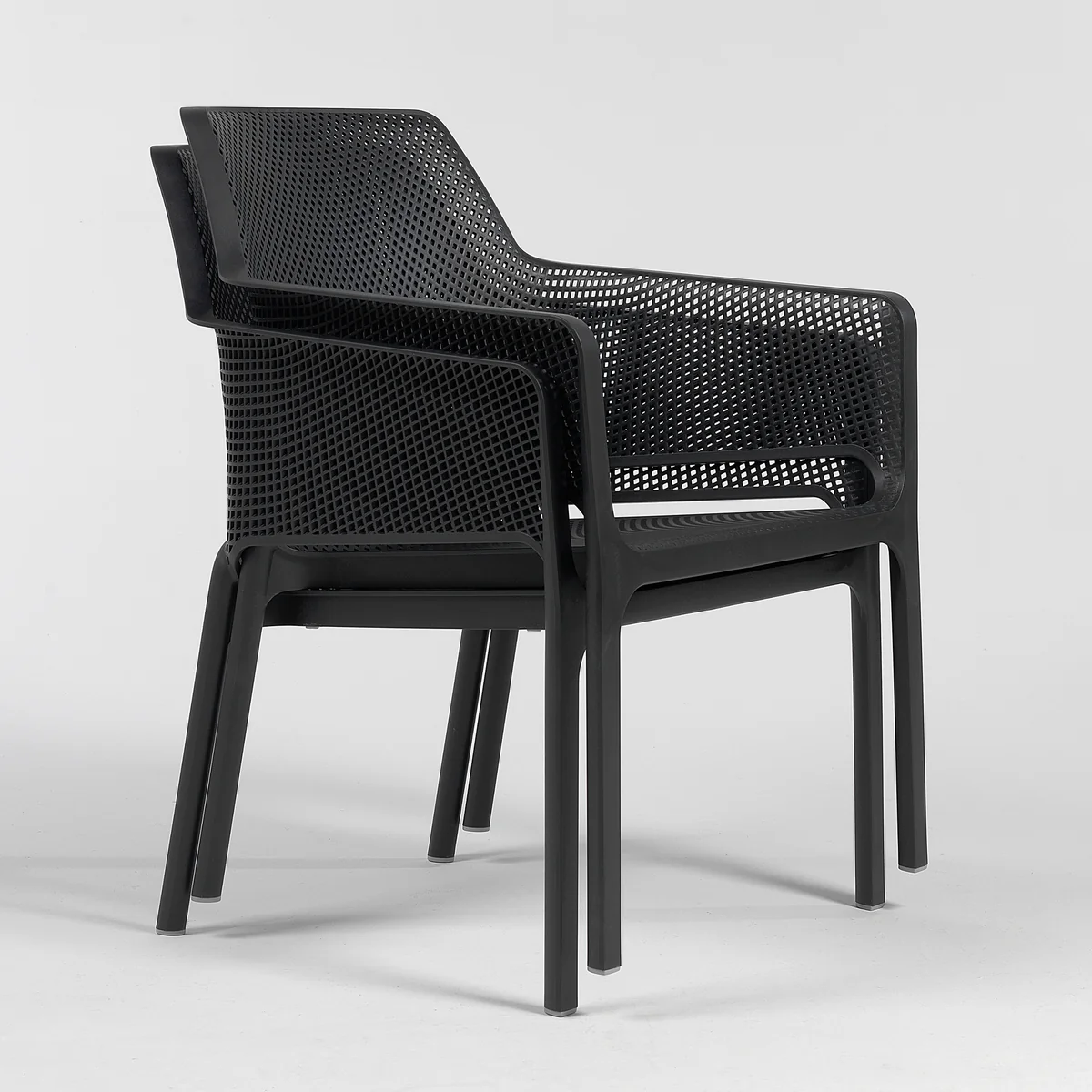 With its generous seat, wide armrests and ergonomic design, the chair invites you to relax and linger. Net Relax chair invites you to linger and relax. The delicate perforated pattern creates an airy look and makes the chair light and comfortable. It is available in several colors and is easily stackable.