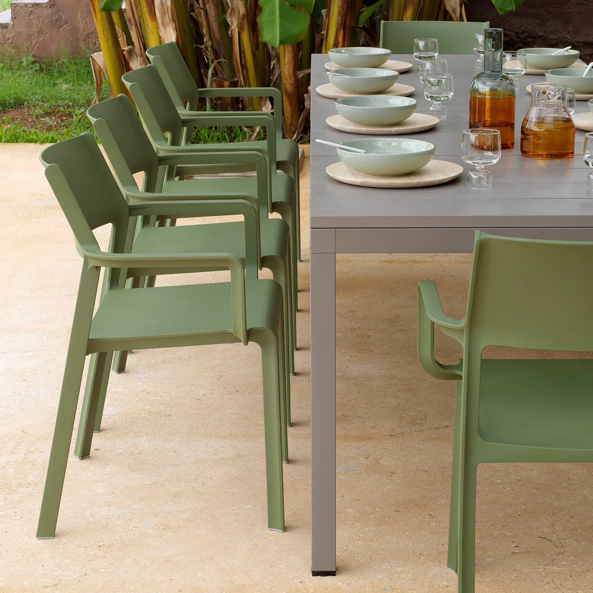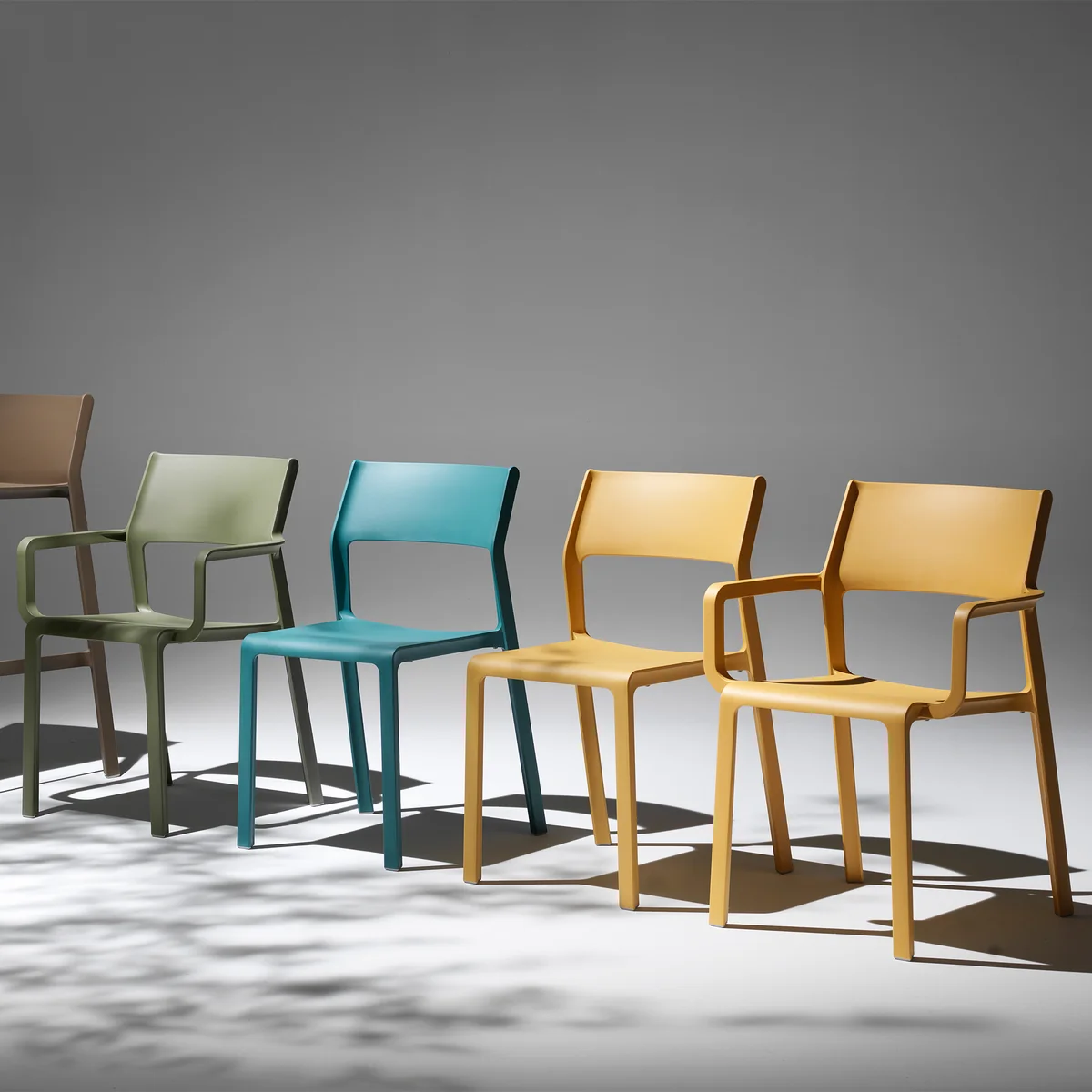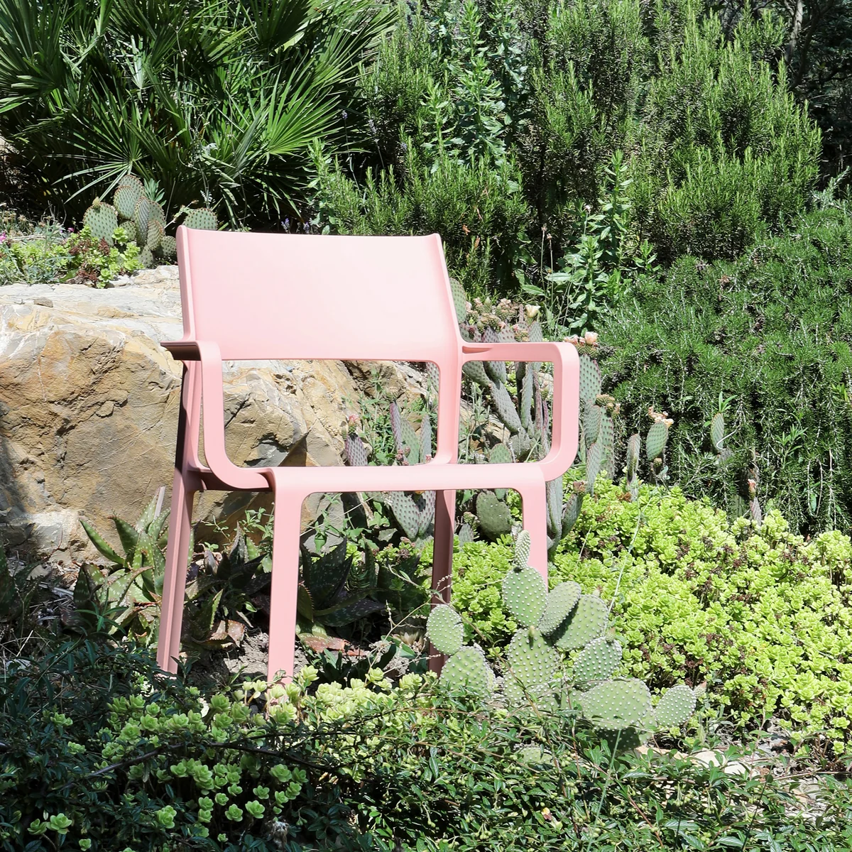 Its curved armrests and ergonomically shaped seat ensure a high level of comfort, while the minimalist design blends harmoniously into various outdoor environments. The Trill armchair is available in several colors and is easy to stack, making it particularly practical.