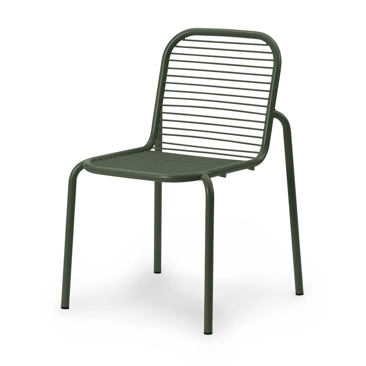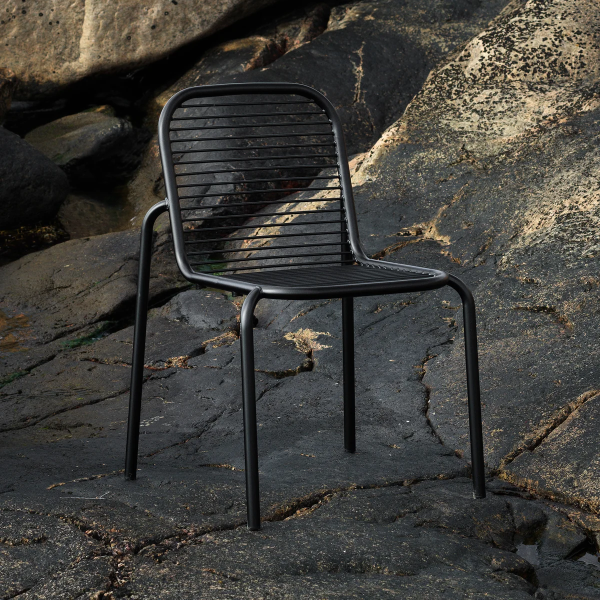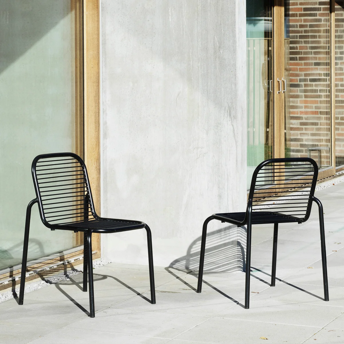 The Vig outdoor chair from Normann Copenhagen . The Vig collection presents outdoor furniture characterized by a timeless and functional design and made of double powder-coated steel to ensure a long outdoor life. The comprehensive Vig collection includes stackable outdoor furniture such as armchairs and benches in various sizes.