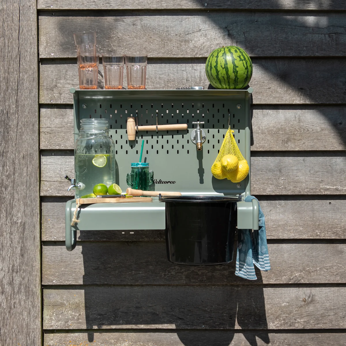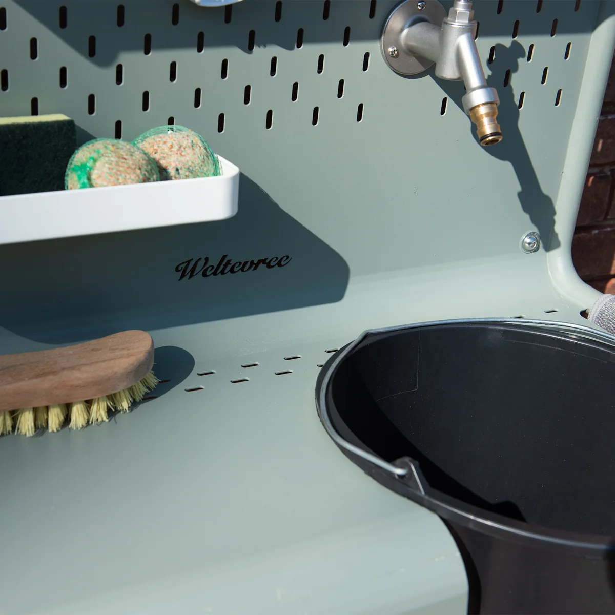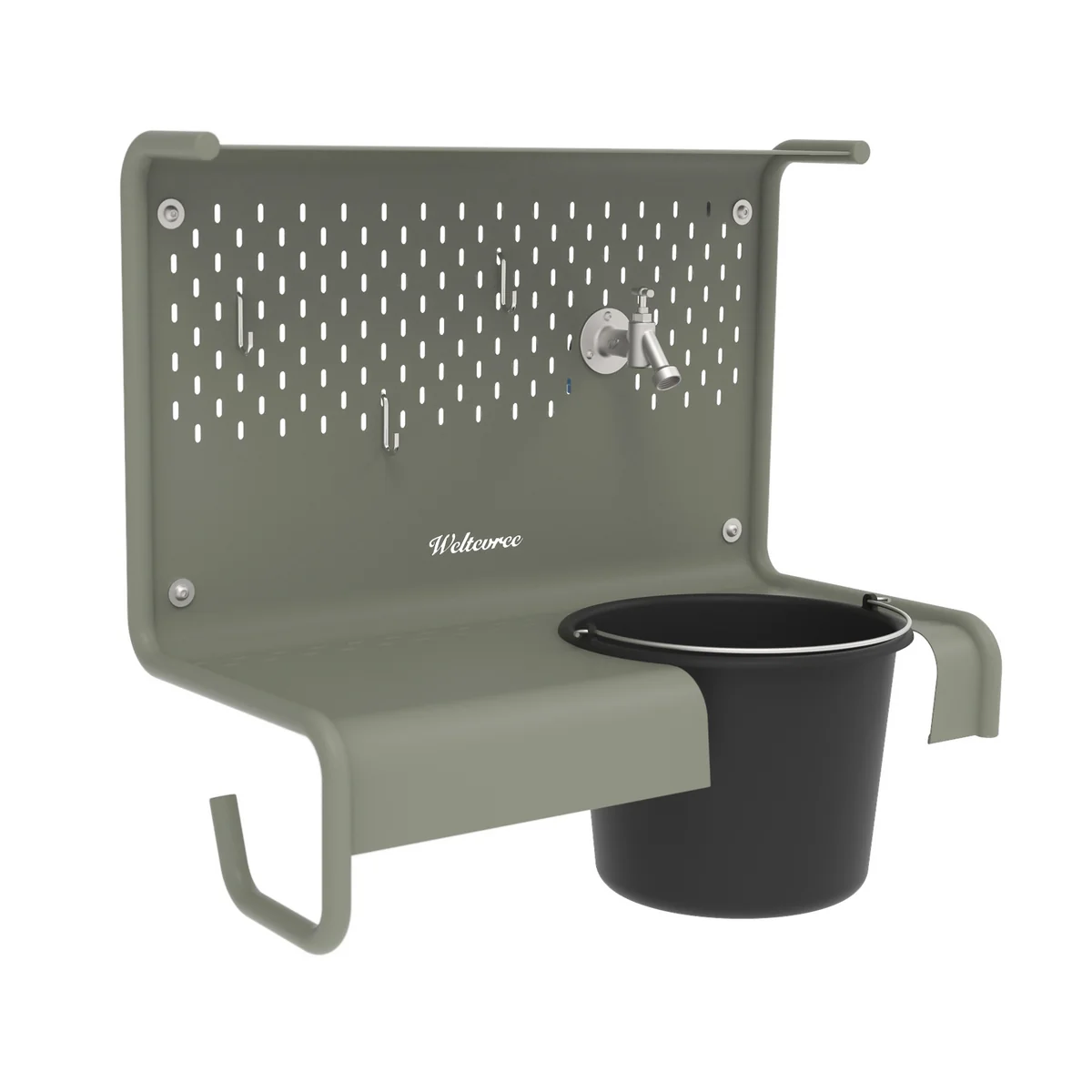 Waterworks From Weltevree creates useful outdoor space right in front of the house and eliminates the chaos around the faucet on the wall. It features counter space, a real faucet, and other organizers, such as a large hook for towels, small hooks for gardening supplies, and a top shelf. The bucket is also included.