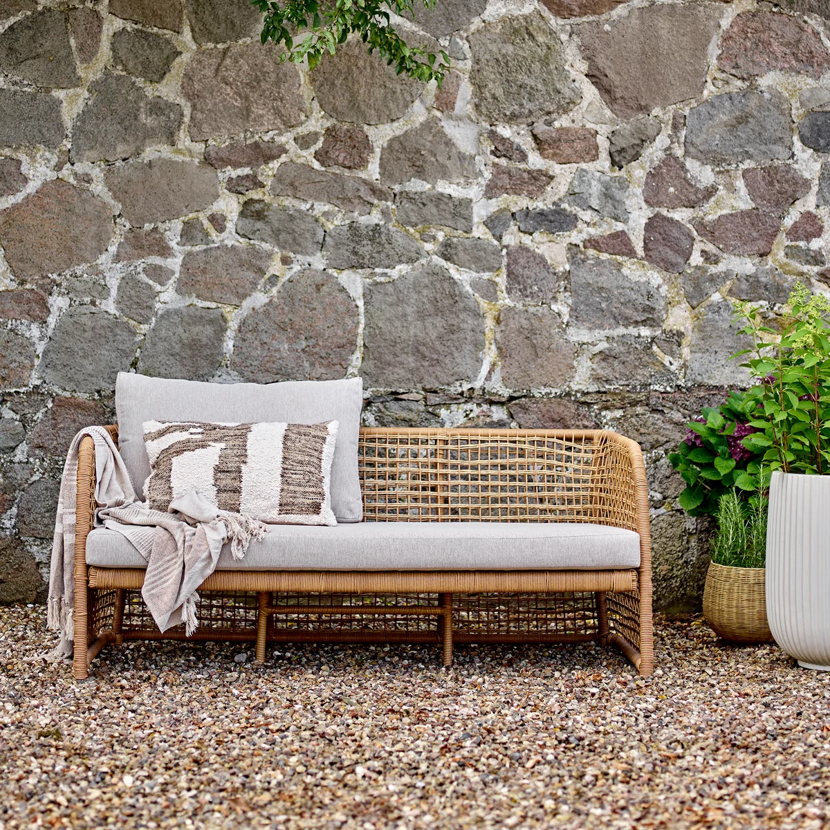 With its airy poly-rattan design and soft woven cushions, the Penzano sofa from Bloomingville brings a cozy, inviting atmosphere to your outdoor area. Ideal for the patio or garden, it invites you to relax and linger - ideally combined with other natural materials and textures.