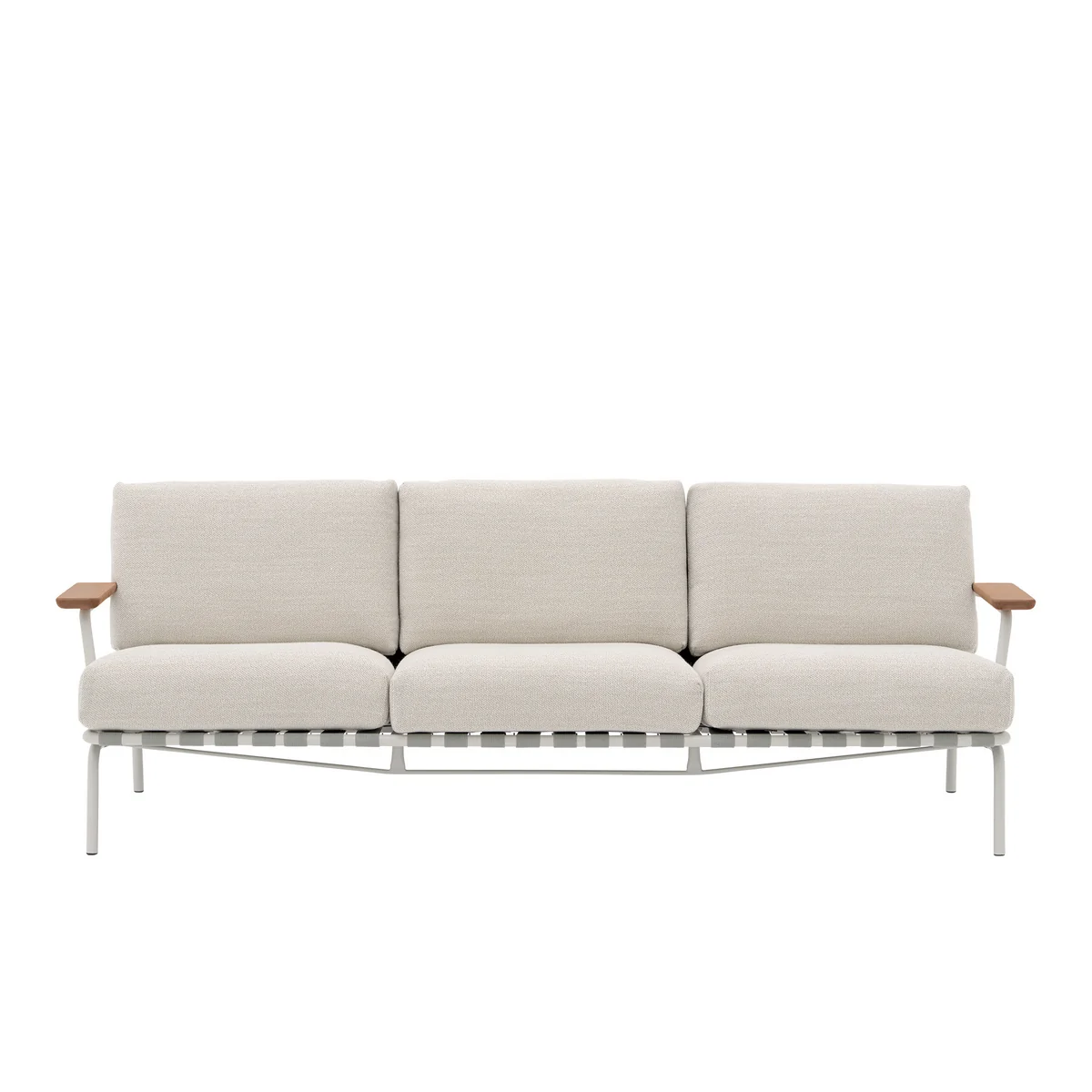 The Settle outdoor 3-seater sofa with armrests combines Scandinavian design lightness with generous seating comfort and durable materials. Inspired by the clean lines of the 50s and 60s, the delicate construction of bent steel tubes creates an open, elegant silhouette that adds a modern touch to any outdoor area.