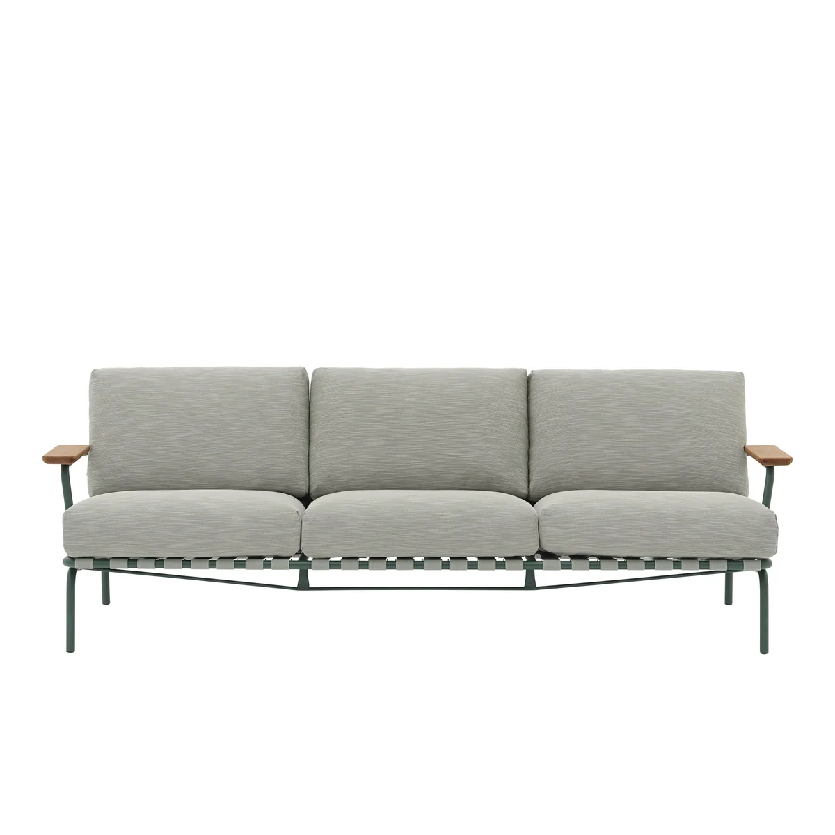 The Settle outdoor 3-seater sofa with armrests combines Scandinavian design lightness with generous seating comfort and durable materials. Inspired by the clean lines of the 50s and 60s, the delicate construction of bent steel tubes creates an open, elegant silhouette that adds a modern touch to any outdoor area.