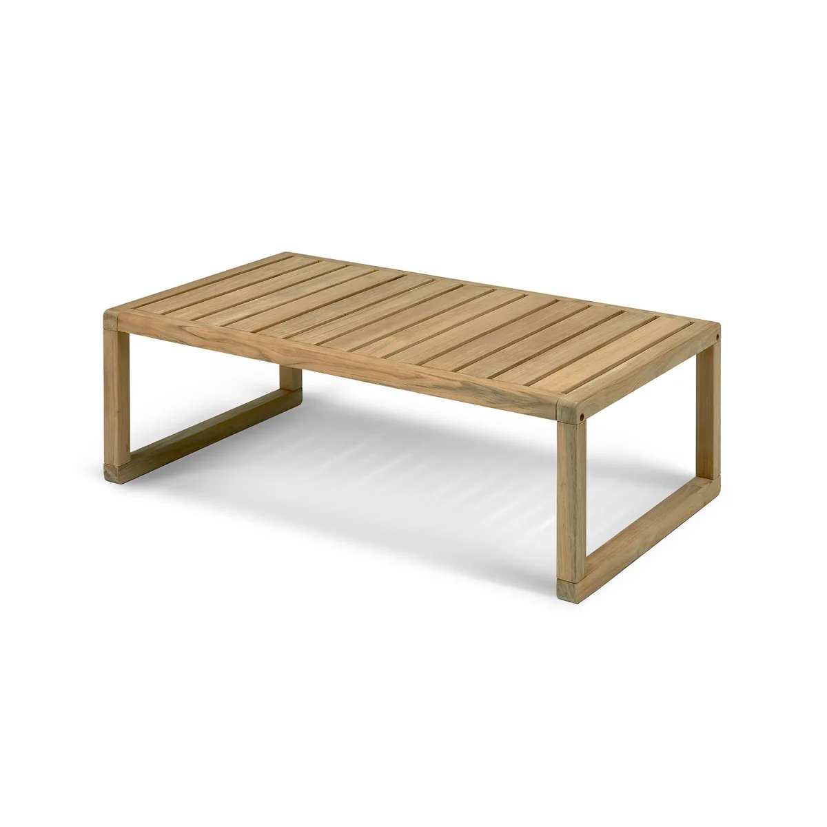 The Virkelyst Side Table by Says Who for Skagerak is an outdoor furniture piece that features clean lines. Its surface is made of teak slats that allow rainwater to drain easily while providing a light and airy appearance. The table top is enthroned on a rectilinear frame with a sled base.