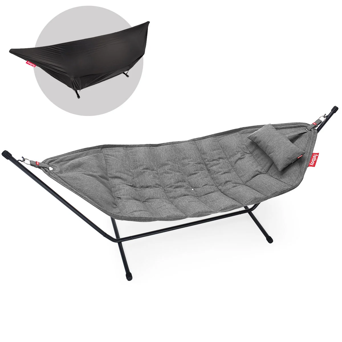 The Headdemock hammock Superb Deluxe from Fatboy has a comfortable pillow, a sturdy frame and a protective cover in addition to the mat itself. It is suitable for two people (max. 150 kg) and is not dependent on a rope or tree.