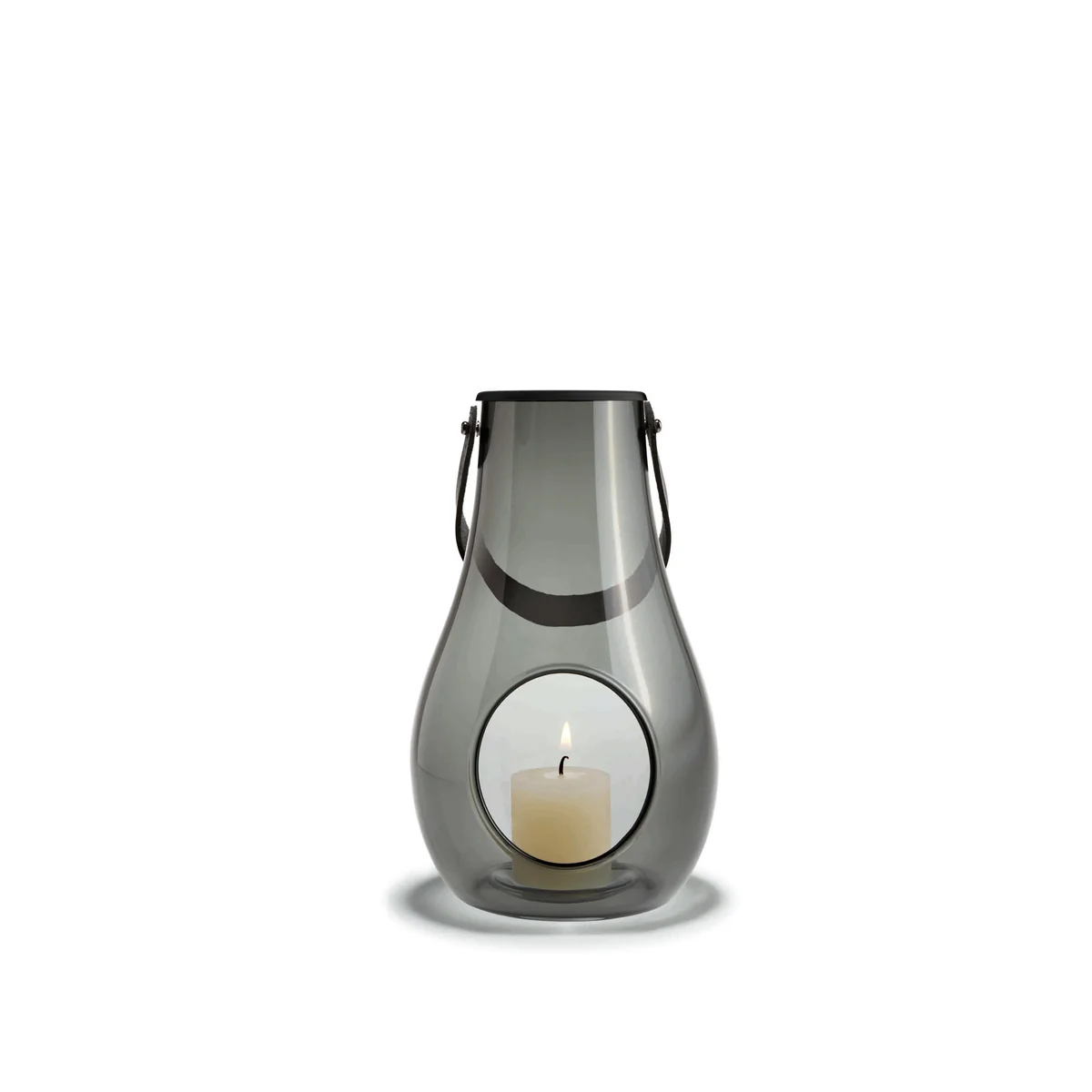 The lanterns with leather handles from Holmegaard have been designed in transparent or matt white glass. Tea lights or block candles can be placed in the teardrop-shaped center as required.