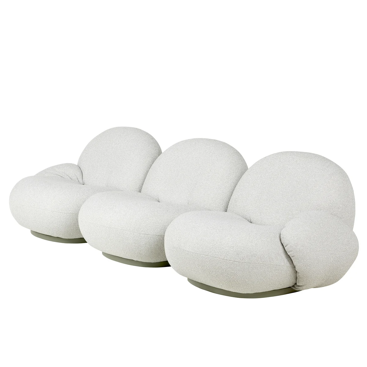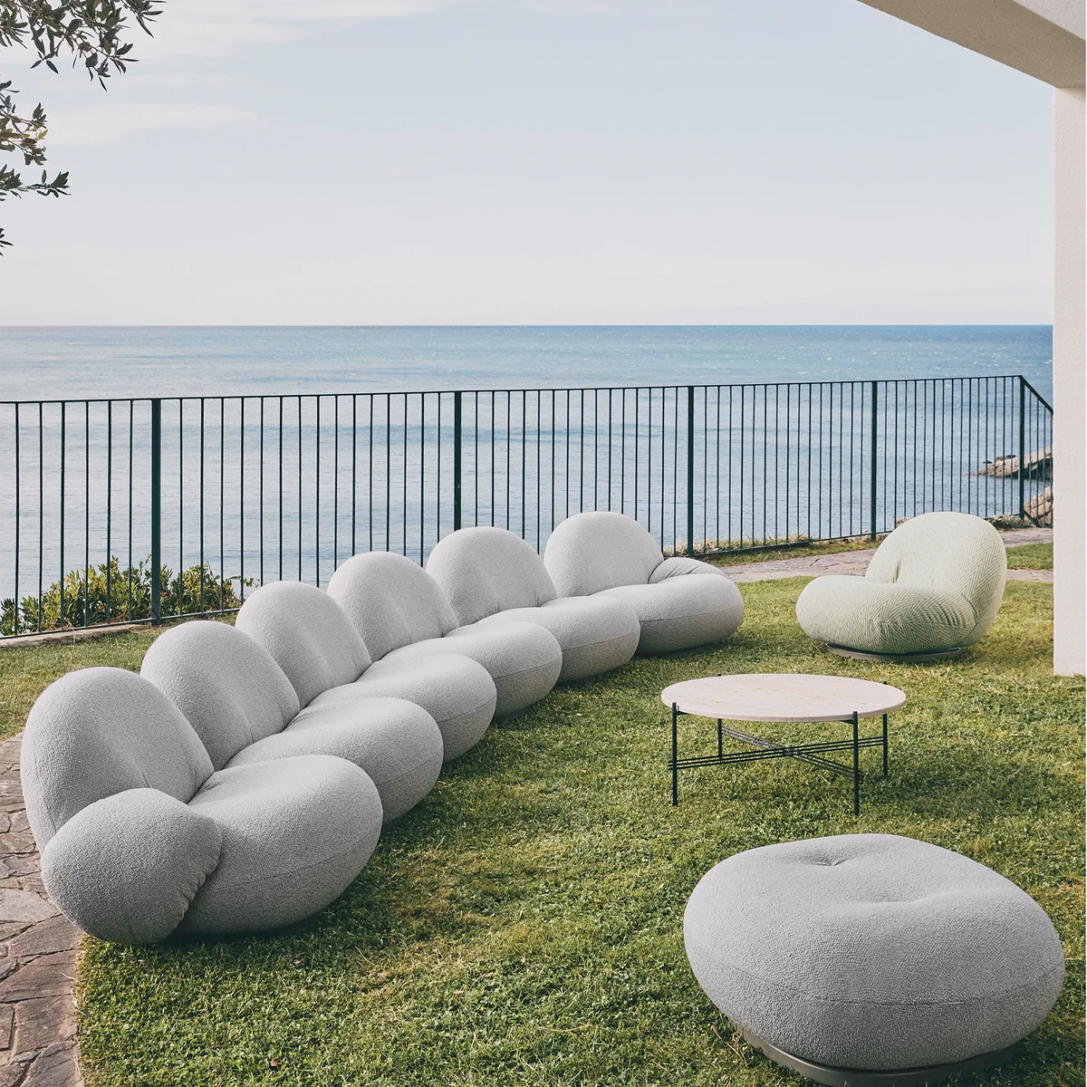 The Pacha Outdoor Sofa from the Danish manufacturer Gubi fits harmoniously to the body thanks to its rounded shape. The modern sofa with plate feet is covered with Dedar Belsuede. The upholstery fabric is made of 100% polypropylene. The Pacha Outdoor sofa can be used indoors or outdoors as you wish. It is available in different seat finishes.